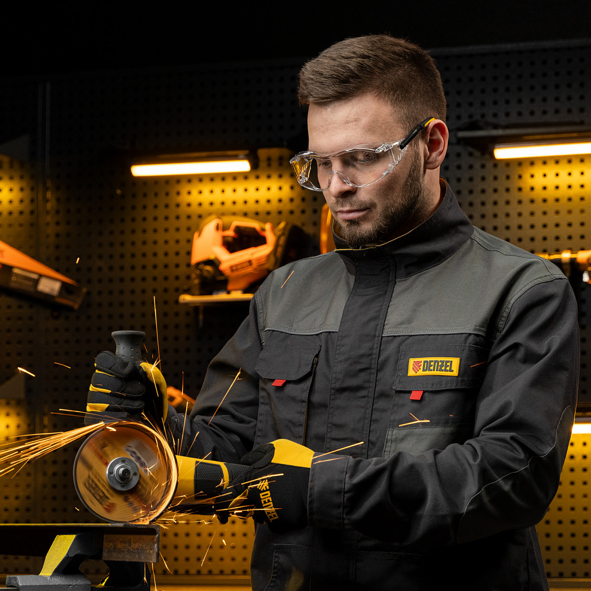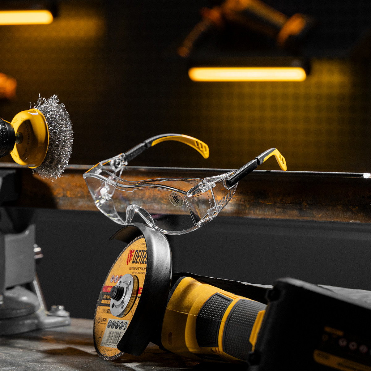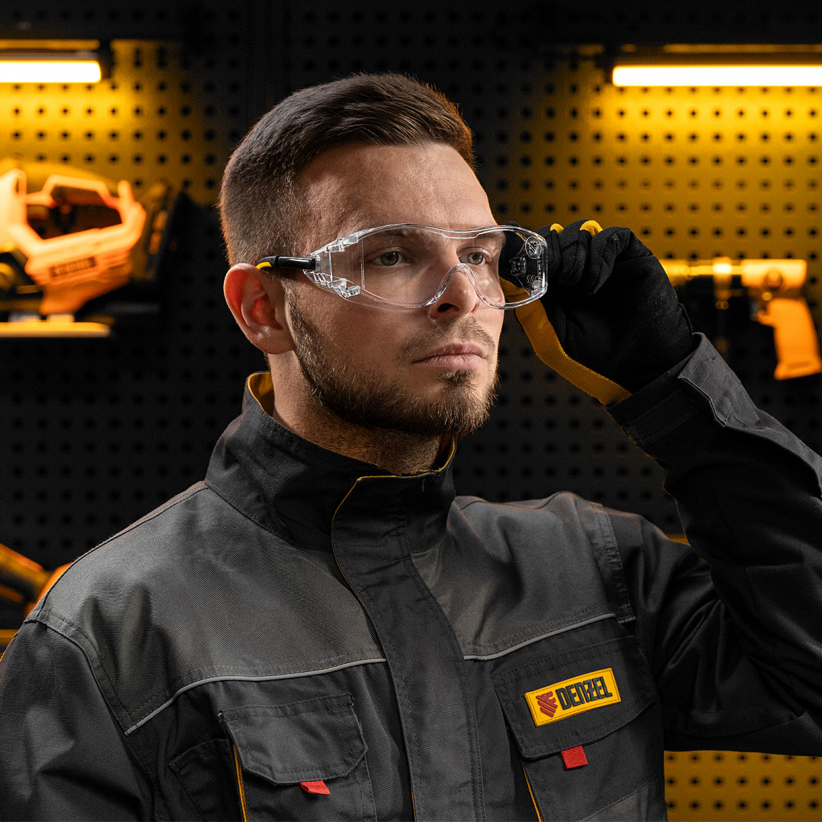• Продуманная конструкция — особая форма линз обеспечивает боковую и надбровную защиту, а также позволяет носить защитные очки вместе с коррригирующими.
