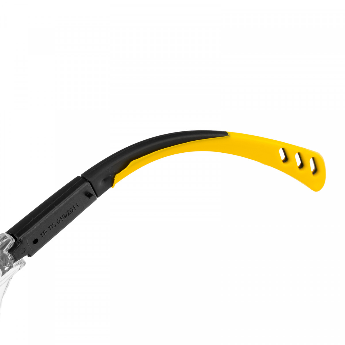 Очки защитные открытые Denzel 89201 с увеличенными поликарбонатными прозрачными линзами и регулируемыми дужками предназначены для защиты глаз от механических повреждений и УФ-излучения. Очкам присвоен класс механической прочности F, они обеспечивают защиту от высокоскоростных частиц с низкоэнергетическим ударом (скорость частиц до 45 м/с). Легкие универсальные очки используются во время работы с электро- и бензоинструментом, на производстве и в быту.