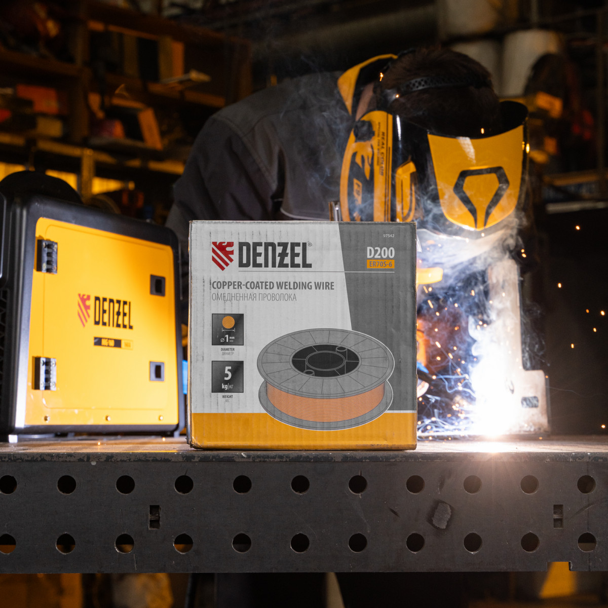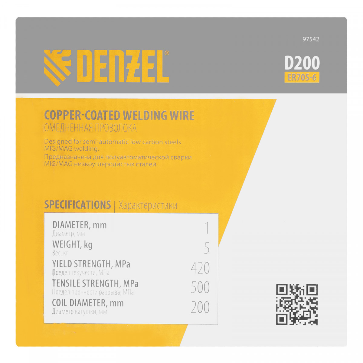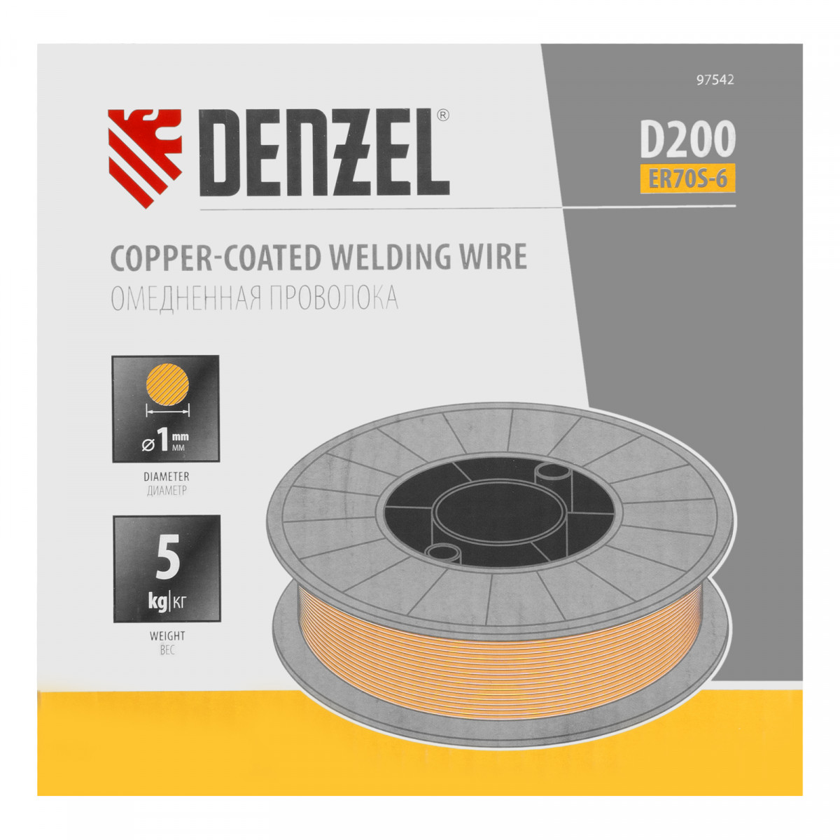 Омедненная проволока Denzel ER70S-6 97542 диаметром 1 мм и весом 5 кг, на катушке типа D200, предназначена для полуавтоматической сварки MIG/MAG углеродистых и низколегированных сталей в среде защитных газов. Необходима профессиональным сварщикам, пригодится также частному мастеру.