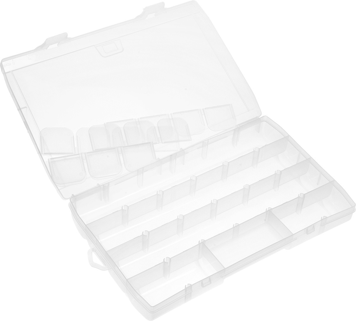 Органайзер используется при хранении и транспортировке мелкого инструмента и оснастки. Приспособление выполнено из прозрачного пластика, который отличается высокой прочностью. Конструкция органайзера включает два запорных механизма для безопасности при хранении и переноске.