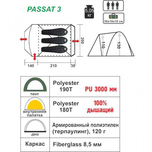 Просторная четырехместная палатка Helios PASSAT-3 – это отличный вариант для путешествий в любое время года. Helios PASSAT-3 – палатка универсальной серии,разработанная для любителей охоты, рыбалки, пеших и велосипедных прогулок. Каркас данной модели, изготовленный из прочного стекловолокна диаметром 8,5 мм, выдержит сильные нагрузки ветра и резкие перепады температуры. Так же надежной защитой от дождя и ветра будут материал тента, выполненный из полиэстера 190T, с водоотталкивающей пропиткой 2000 PU, ветровые юбки (внешняя и внутренняя) и проклеенные швы по всему периметру палатки. К преимуществам модели Helios PASSAT-3 можно отнести её компактную,легкую и быстро разборную конструкцию, включающую в себя просторный тамбур, большое спальное отделение и 3 выхода из палатки на разные стороны.