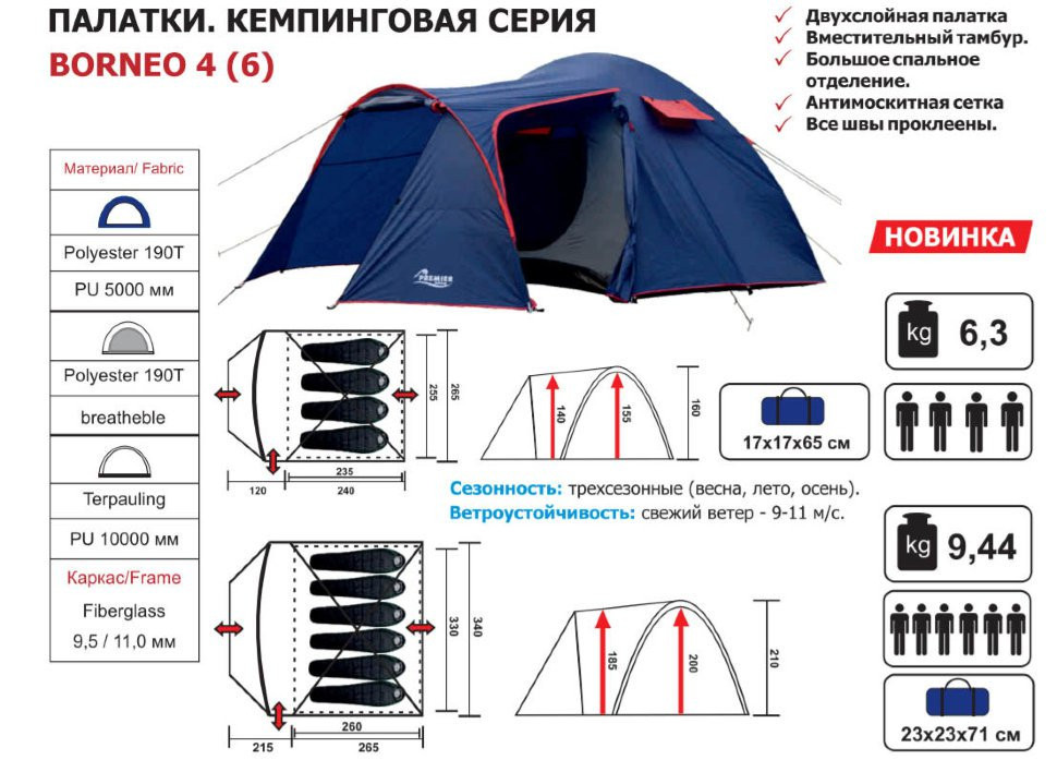 Палатка Borneo 6 – вместительная трекингровая палатка, которая предназначена для выездов на природу всей семьей или большой компанией друзей (6 человек). Конструкция этой шестиместной палатки продумана до мелочей, форма палатки - полусфера.