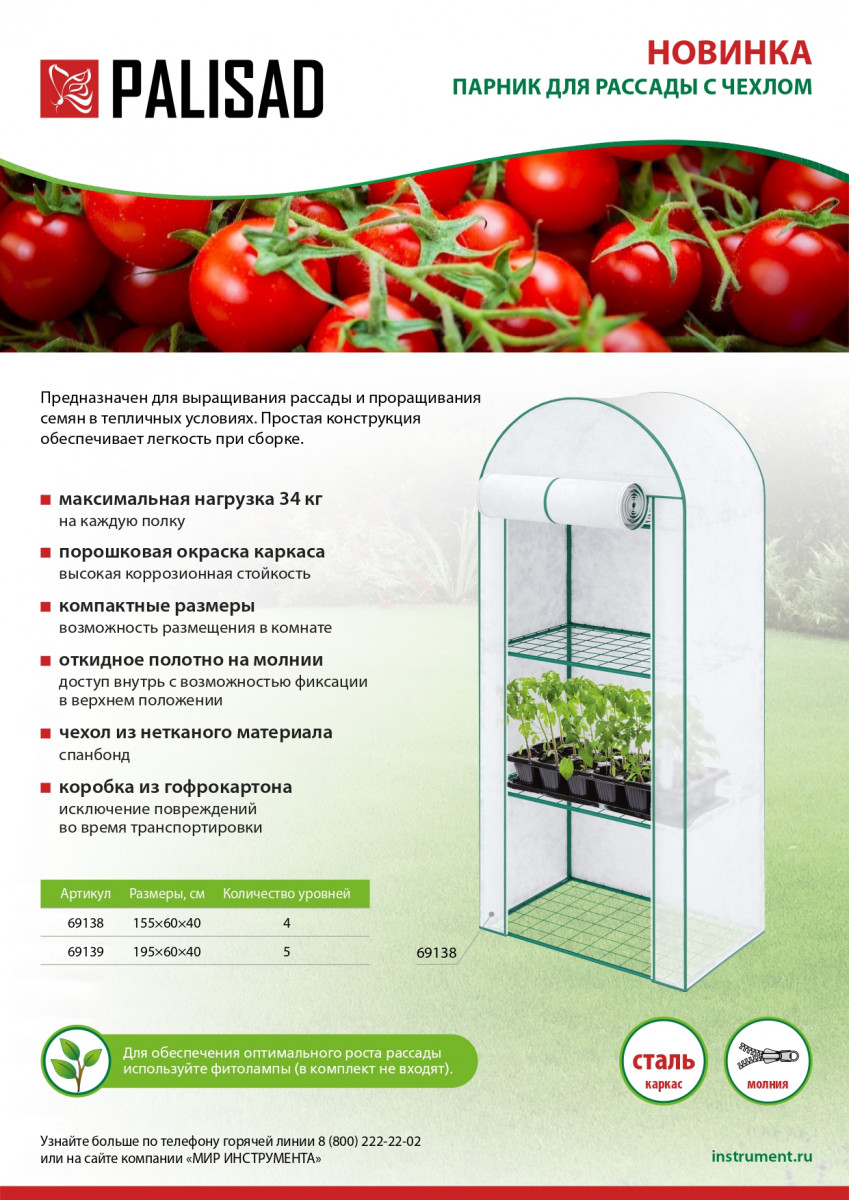 Парник для рассады Palisad 69139 размером 195 х 60 х 40 см, с 5 уровнями, с чехлом, предназначен для выращивания садовых и огородных культур. Чехол из нетканого материала (спанбонд) защищает растения от ветра и избытка солнечного света, не препятствует воздухообмену и обеспечивает рассаде естественную вентиляцию.