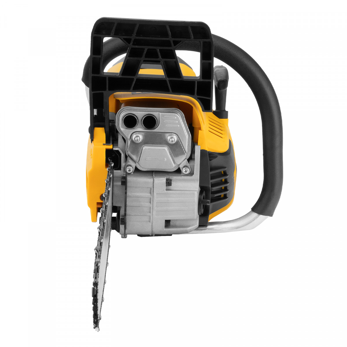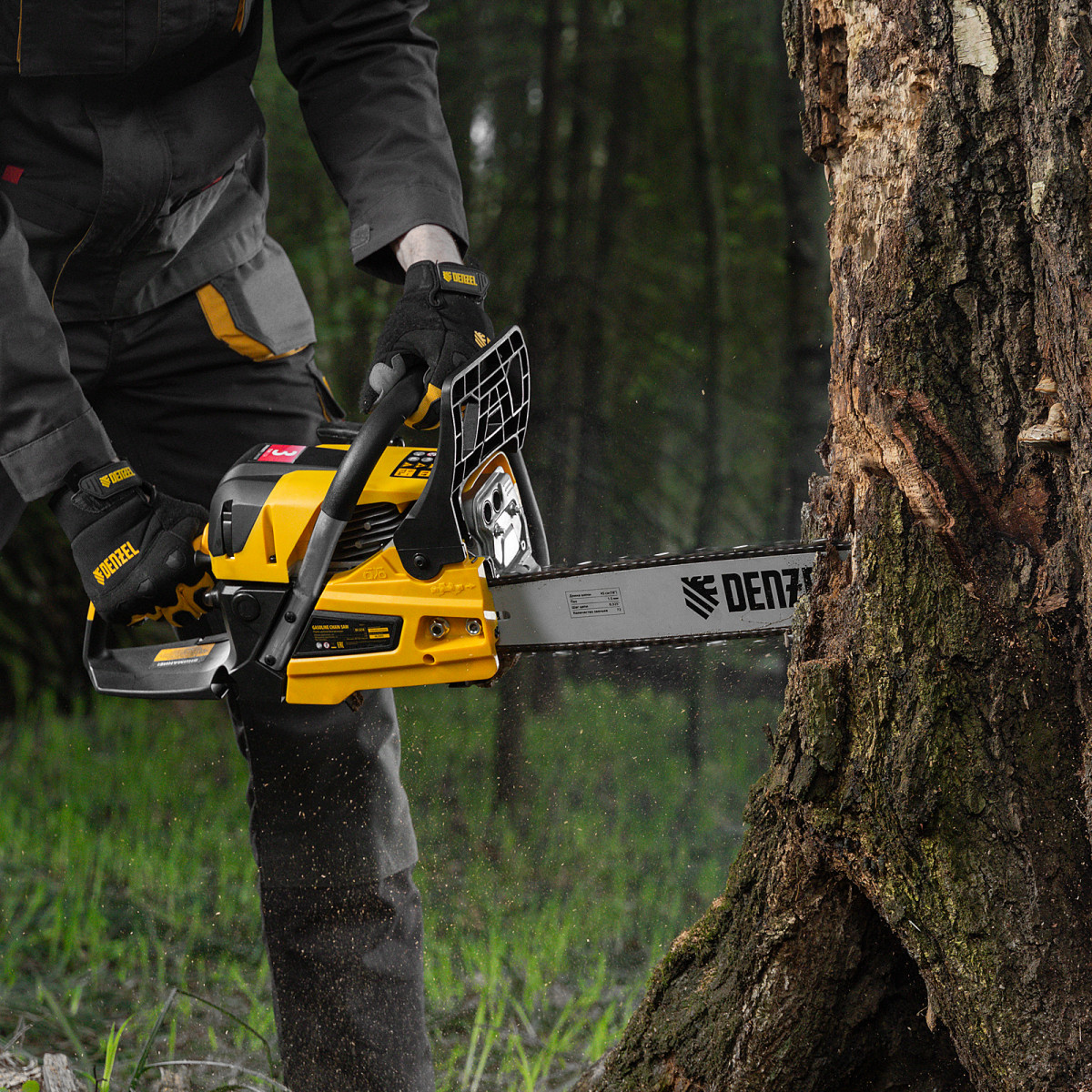 • Безопасная работа — блокировка от случайного запуска и моментальное срабатывание тормоза цепи при отскоке пилы снижают вероятность получения травм.