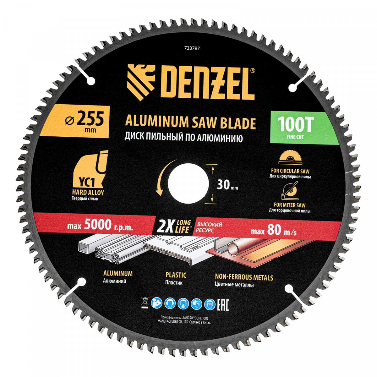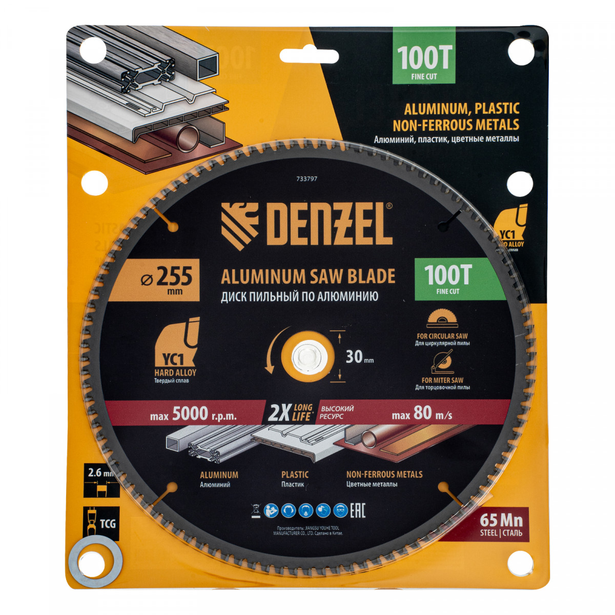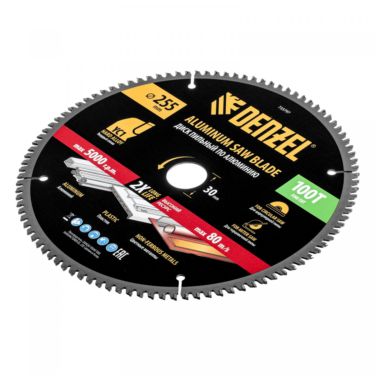 Пильный диск Denzel 733797 диаметром 255 x 30 мм, с 100 зубьями, предназначен для точного распиливания заготовок из алюминия, пластика, цветных металлов. Устанавливается на циркулярную или торцовочную пилу, также возможно использование с распиловочным станком. Зубья трапециевидно-плоского типа (TCG) с отрицательным углом заточки обеспечивают ровный рез без сколов. В комплект поставки входит переходное кольцо 30/20 мм, позволяющее изменить посадочный диаметр при необходимости.