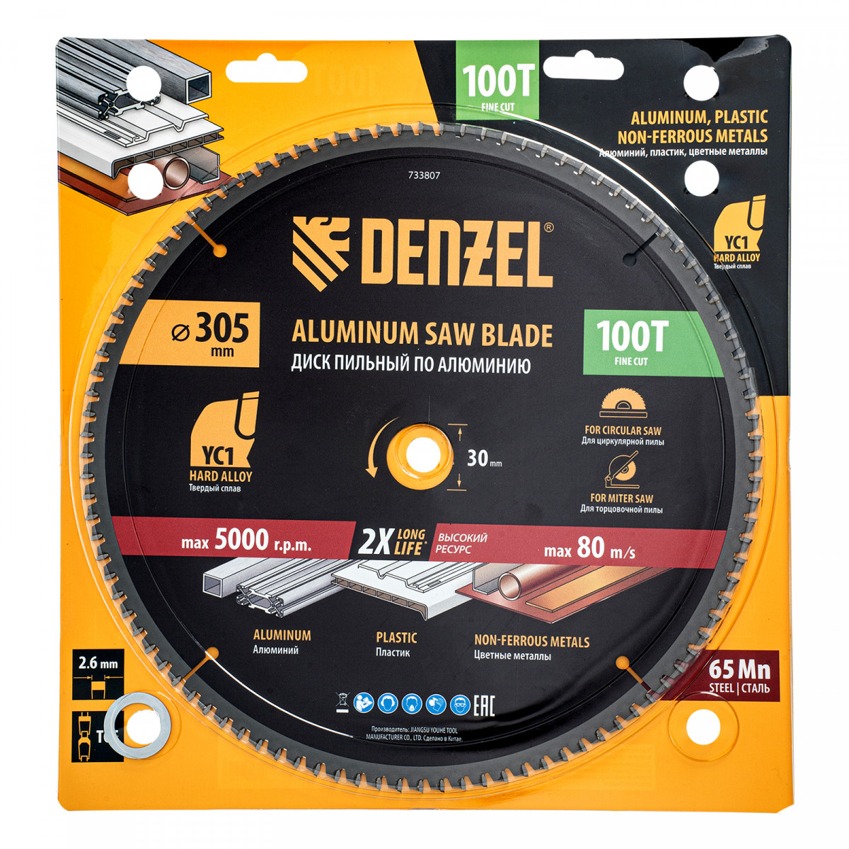 Пильный диск Denzel 733807 диаметром 305 x 30 мм, с 100 зубьями, предназначен для точного распиливания заготовок из алюминия, пластика, цветных металлов. Устанавливается на циркулярную или торцовочную пилу, также возможно использование с распиловочным станком. Зубья трапециевидно-плоского типа (TCG) с отрицательным углом заточки обеспечивают ровный рез без сколов. В комплект поставки входит переходное кольцо 30/20 мм, позволяющее изменить посадочный диаметр при необходимости.