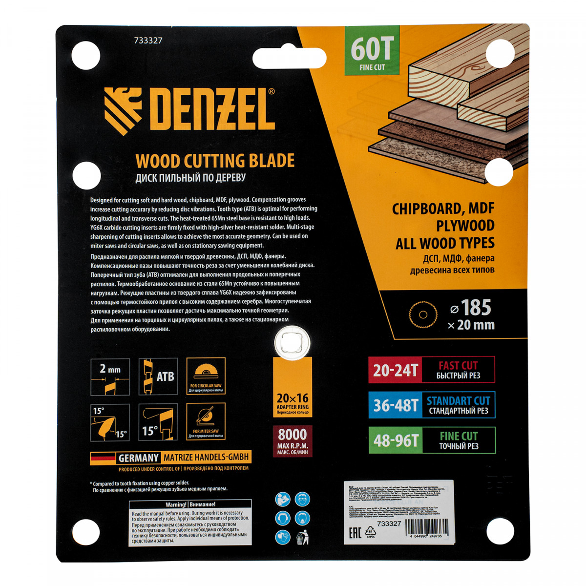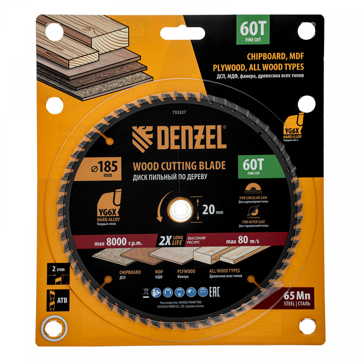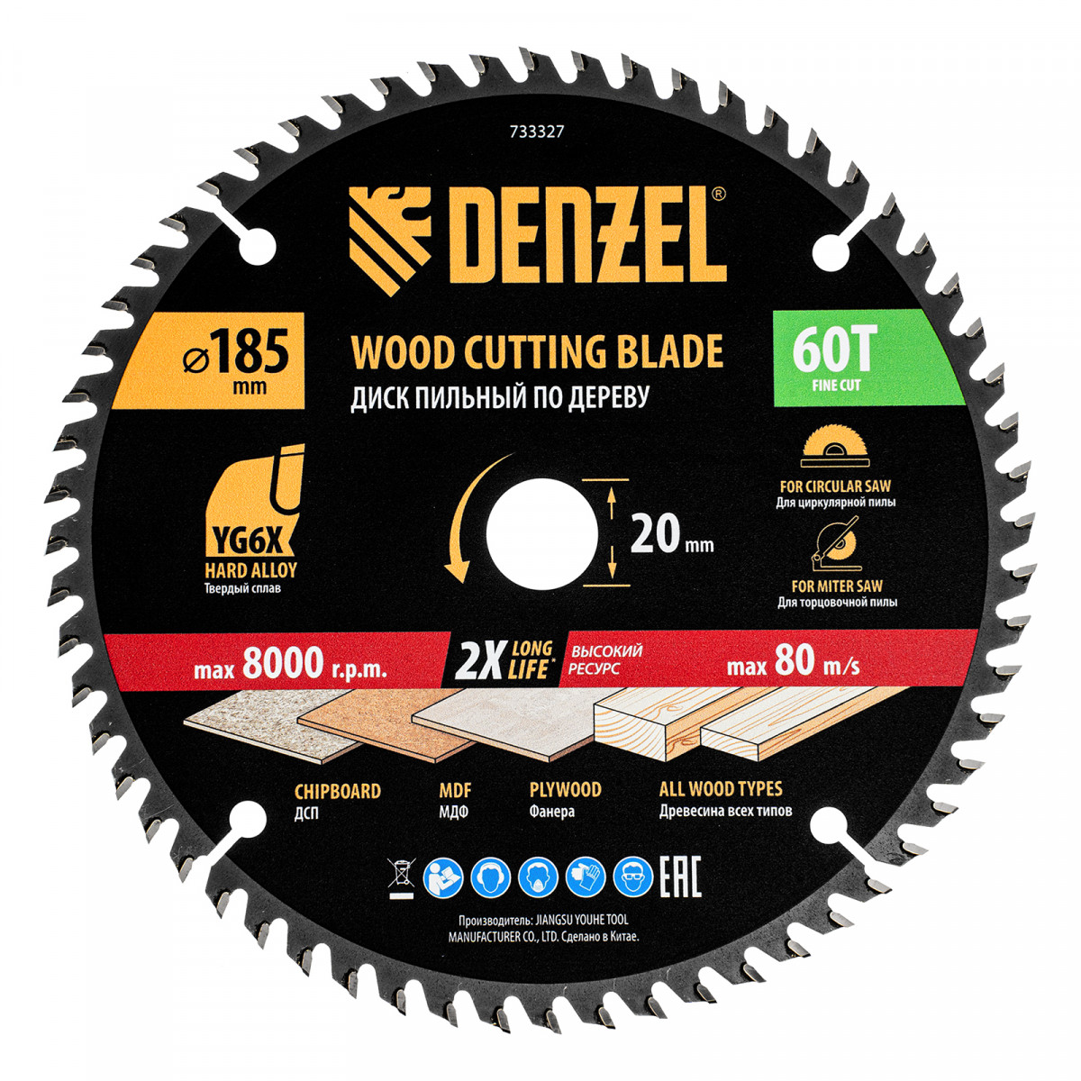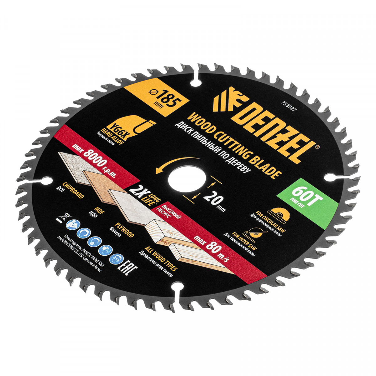 Пильный диск Denzel 733327 диаметром 185 x 20 мм, с 60 зубьями, предназначен для точного продольного и поперечного распила твердой и мягкой древесины, фанеры, МДФ, ДСП. 60 зубьев типа ATB с режущими пластинами оптимальной геометрии обеспечивают чистый рез. Режущие пластины из твердого сплава YG6X сохраняют рабочие свойства при интенсивном использовании. Диск устанавливается на циркулярную, торцовочную пилу или на распиловочный станок. В комплект поставки входит переходное кольцо с 20 на 16 мм, что позволяет изменить посадочный размер и расширяет возможности использования диска.