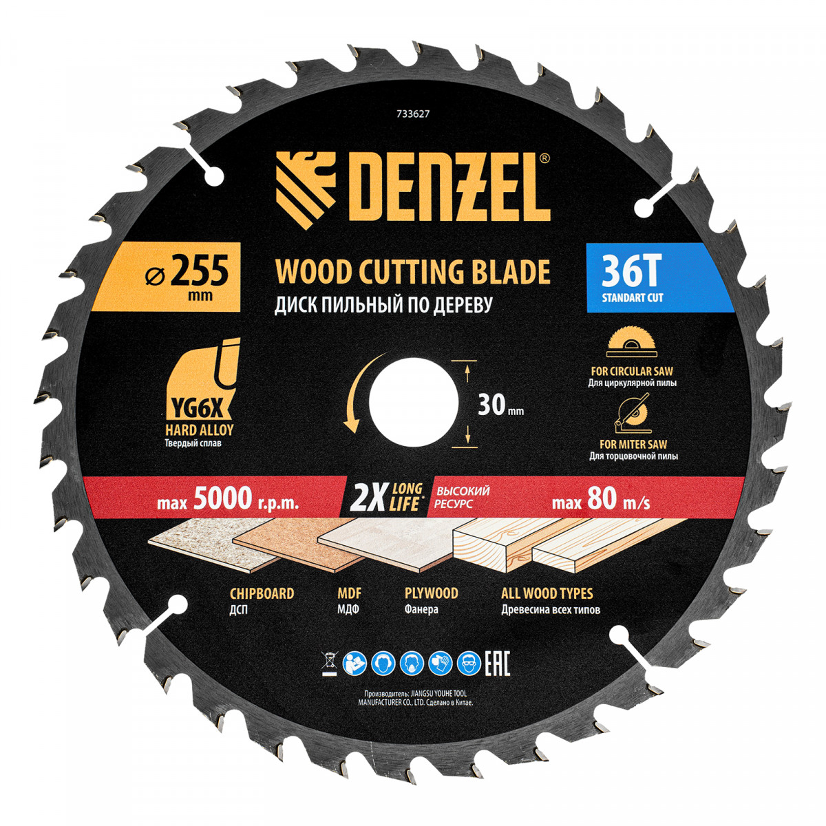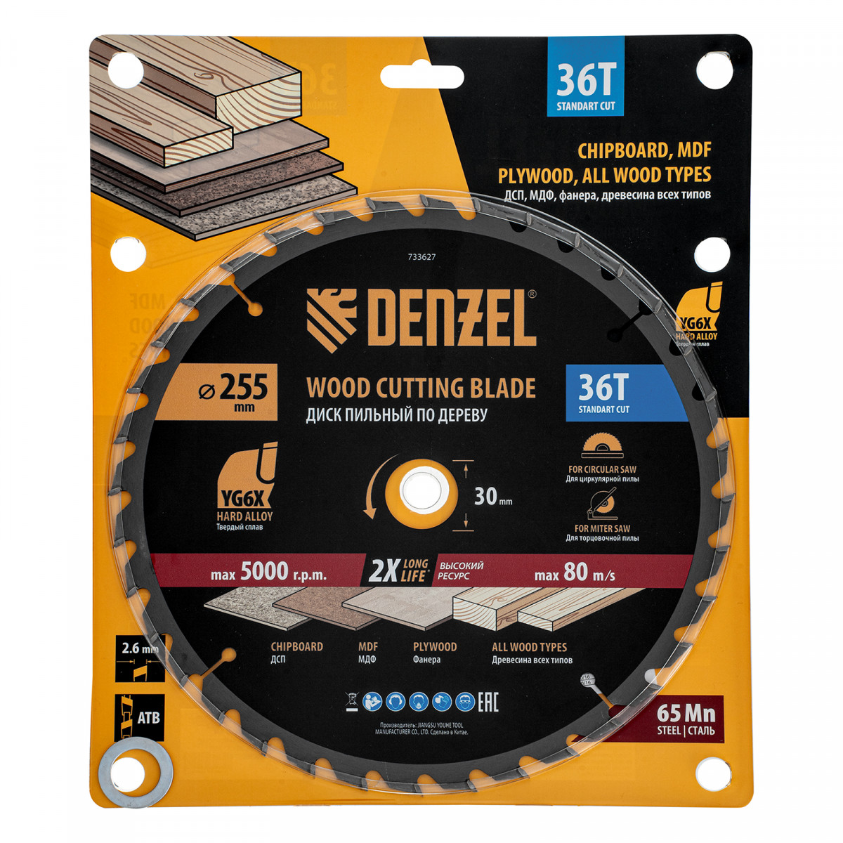 Пильный диск Denzel 733627 диаметром 255 x 30 мм, с 36 зубьями, предназначен для продольного и поперечного распила твердой и мягкой древесины, фанеры, МДФ, ДСП. 36 зубьев типа ATB с режущими пластинами оптимальной геометрии обеспечивают качественный рез. Тип реза — стандартный. Режущие пластины из твердого сплава YG6X сохраняют рабочие свойства при интенсивном использовании. Диск устанавливается на циркулярную, торцовочную пилу или на распиловочный станок. В комплект поставки входит переходное кольцо с 30 на 20 мм, что позволяет изменить посадочный размер и расширяет возможности использования диска.
