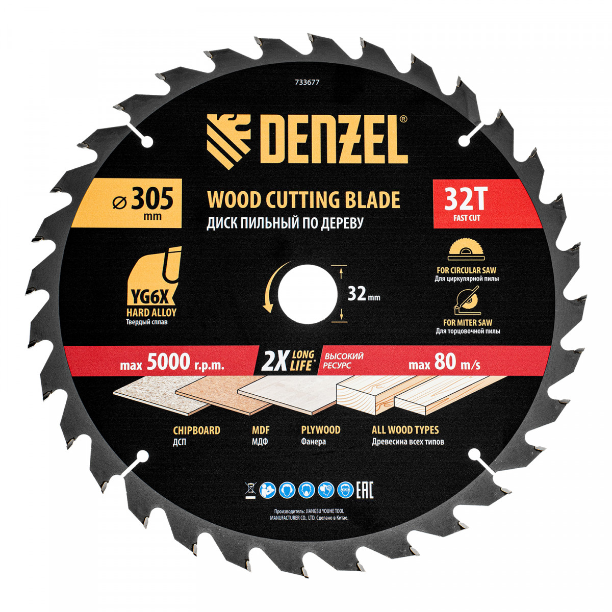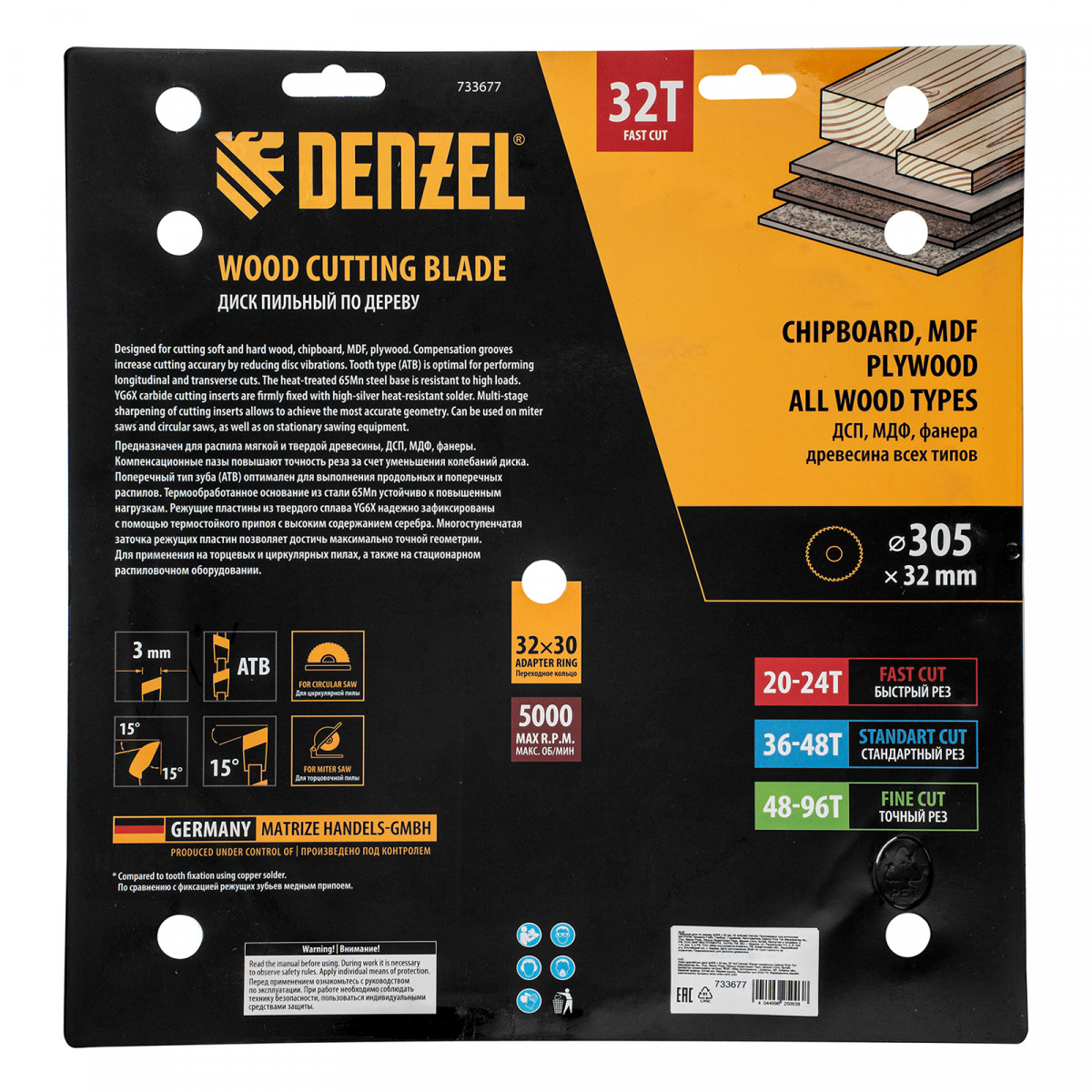 Пильный диск Denzel 733677 диаметром 305 x 32 мм, с 32 зубьями, предназначен для быстрого продольного и поперечного распила твердой и мягкой древесины, фанеры, МДФ, ДСП. 32 зуба типа ATB с режущими пластинами оптимальной геометрии обеспечивают качественный рез. Режущие пластины из твердого сплава YG6X сохраняют рабочие свойства при интенсивном использовании. Диск устанавливается на циркулярную, торцовочную пилу или на распиловочный станок. В комплект поставки входит переходное кольцо с 32 на 30 мм, что позволяет изменить посадочный размер и расширяет возможности использования диска.