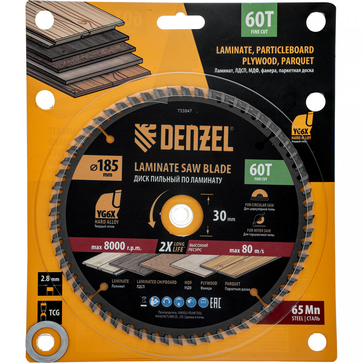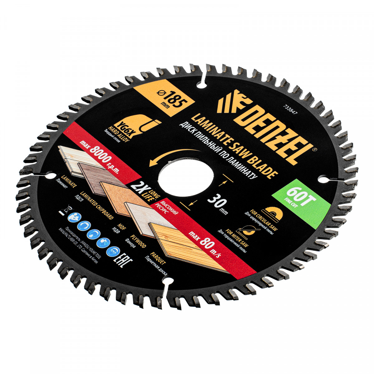 Пильный диск Denzel 733847 диаметром 185 x 30 мм, с 60 зубьями, используется для точного распиливания ламината, ЛДСП, МДФ, фанеры, паркетной доски. 60 мелких трапециевидно-плоских зубьев с положительным углом заточки позволяют эффективно решать поставленные задачи, обеспечивая чистый рез. Диск устанавливается на циркулярную или торцовочную пилу, а также на распиловочный станок. Можно установить оснастку на инструмент с другим посадочным диаметром — для этого предусмотрено переходное кольцо 30/20 мм.