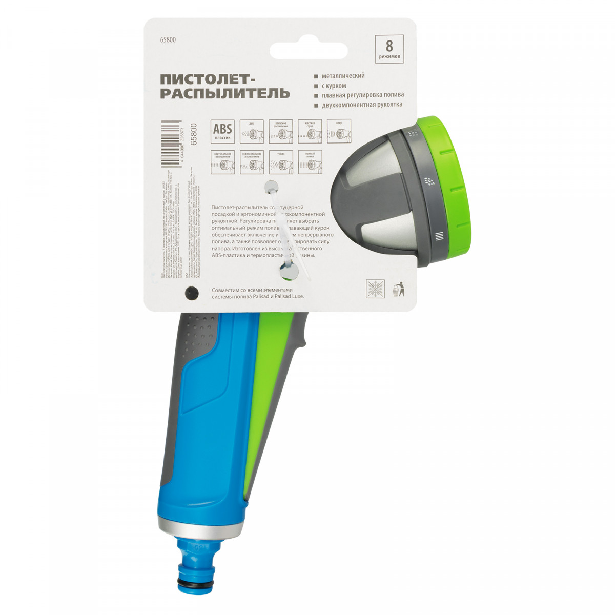 Регулируемый металлический пистолет-распылитель Palisad LUXE 65800 с курком и 8 режимами работы подключается к любым поливочным системам ТМ Palisad и Palisad Luxe для ручного орошения растений на участке, в сквере или парке, а также мытья дорожек и садовых принадлежностей. 8 режимов распыления позволяют выбрать необходимый тип струи для полива различных растений. Пистолет будет полезен садоводам и сотрудникам коммунальных служб.