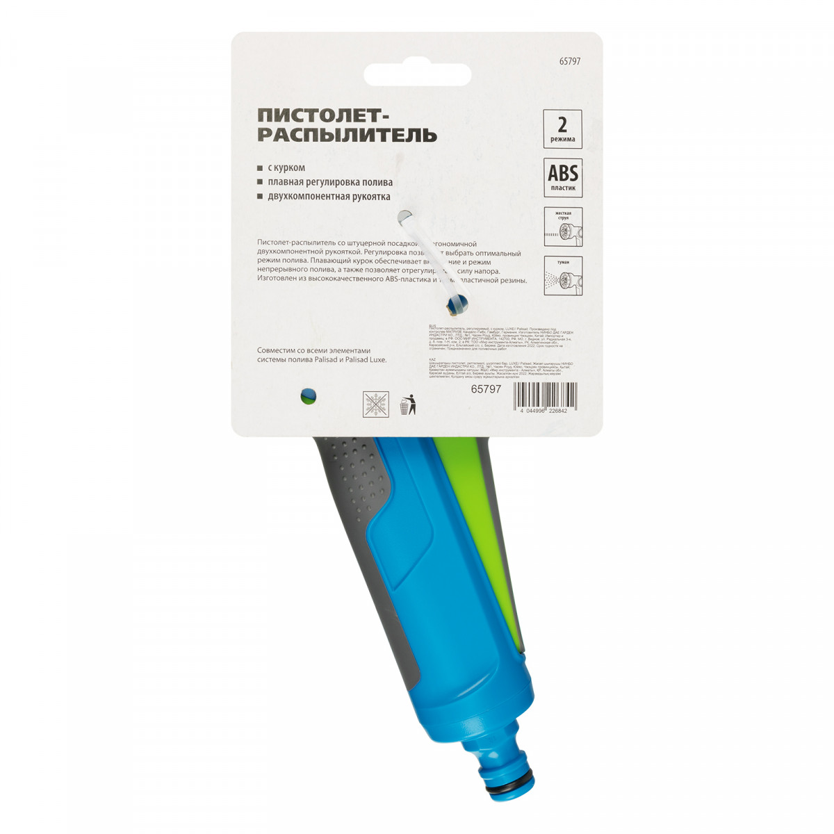 Пистолет-распылитель Palisad LUXE 65797 с курком и регулируемой форсункой обеспечивает подачу жесткой струи воды, конусное распыление и работу в режиме «туман», поэтому позволяет быстро поливать большие участки. Также с его помощью можно очистить дорожки, промыть садовый инвентарь и выполнить другие работы на загородном участке. Пистолет пригодится дачникам и работникам коммунальных служб.