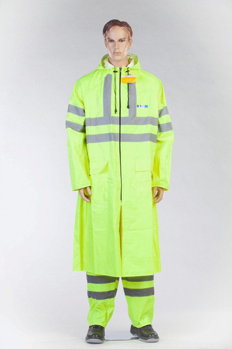 Плащ изготавливается из ткани ярко-оранжевого и ярко-лимонного цветов. Имеет светоотражающие полосы. Соответствует 3-му классу по ГОСТ 12.4.281-2014 "Система стандартов безопасности труда(ССТБ) . Одежда специальная сигнальная повышенной видимости. Технические требования" Удобная конструкция: плащ с застежкой на молнии, клапаном против ветра, капюшоном, двумя карманами с клапанами. Ткань: плащ изготовлен из прочной плащевой ткани с ПВХ покрытием. Вес ткани — 225 гр./метр.кв. Водоупорность ткани не менее 5000 мм водяного столба. Ткань экологична и соответствует европейскому стандарту по содержанию вредных веществ EN 71 PART3. Проклеенные швы: все швы костюма загерметизированы специальной лентой. Изготовлен в полном соответствии с техническим регламентом таможенного союза ТР ТС 019/2011 "О безопасности средств индивидуальной защиты". Декларация и протоколы испытаний предоставляются.