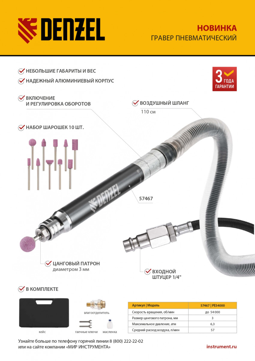 Пневматический гравер PE54000, 54000 об/мин, 3 мм, 57 л/мин Denzel