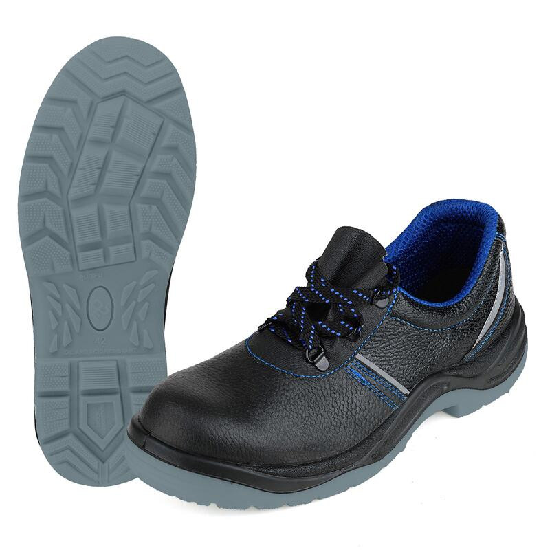 Полуботинки изготовлены методом литья промежуточного слоя подошвы из полиуретана к заготовке верха обуви. На промежуточный слой из полиуретана прилит ходовой слой из термопластичного полиуретана (температурный режим от -40°С до 120°С) со стойкостью к деформациям и истиранию. Имеется пристроченная прилитая задинка. Верх полуботинок из искусственной кожи. Подкладка полуботинок из текстильного материала, стойкого к истиранию и отводящего влагу от стопы. В верхней части полуботинок мягкий кант. Полуботинки завязываются на шнурки и имеют глухой клапан. Шнуровка с использованием металлических люверсов. Стелька вкладная. В носочной части внутренний защитный подносок из металла ударной прочностью 200 Дж. На боковинах световозвращающие элементы в виде полосок. Контрастная отстрочка синего цвета в тон цвета подкладки. Подошва двухслойная (ПУ/ТПУ), маслобензостойкая. Есть внутренняя амортизирующая вставка в пяточной части подошвы. Глубина профиля ходового слоя подошвы составляет 3,5 мм. Цвет полуботинок черный.