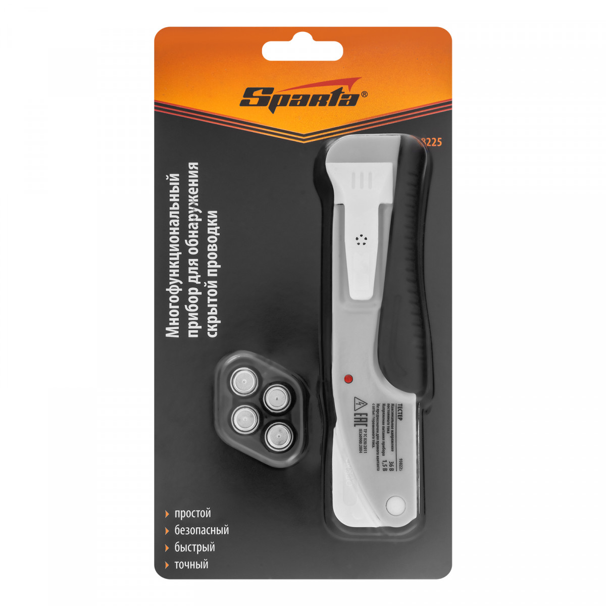 Прибор Sparta 938225 используется для обнаружения скрытой проводки и предметов из металла: труб, решеток, крепежных элементов и т.д. Он пригодится мастерам при сверлении стен, установке розеток, прокладке коммуникаций и других ремонтных работах. Также с его помощью можно определить исправность проводки, приборов, полярность батареек, осуществить контроль заземления и проверить наличие микроволновых и электростатических излучений.