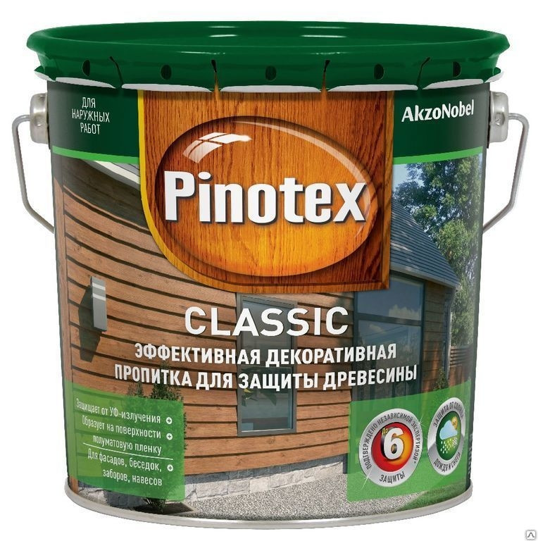 Пропитка cодержит активные добавки против плесени и синевы. Окрашенная поверхность устойчива к воздействию солнца, дождя, снега и мороза. Pinotex Classic легко наносится и быстро впитывается в поверхность древесины, образуя полуматовое покрытие. Подчеркивает естественную текстуру древесины. Для усиленной защиты глубоких слоев древесины от биокоррозии рекомендуется применять пропитку в системе с грунтовкой  Pinotex Base. Возможно применение для защиты бревенчатых строений и полукруглых облицовочных профилей.