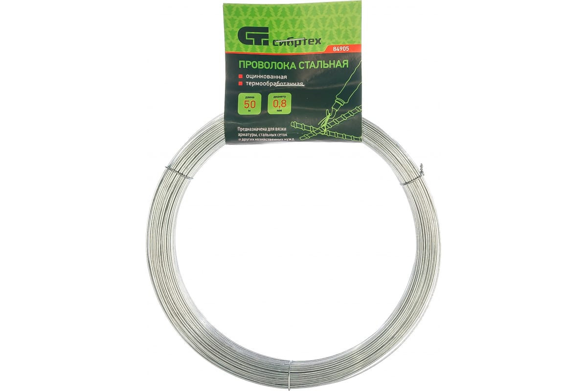 тальная проволока Сибртех 84905 диаметром 0,8 мм и длиной 50 м, оцинкованная и термообработанная, пригодится в хозяйстве для несложных строительных работ. Применяется для армирования конструкций, обвязки сеток и фиксации различных предметов.