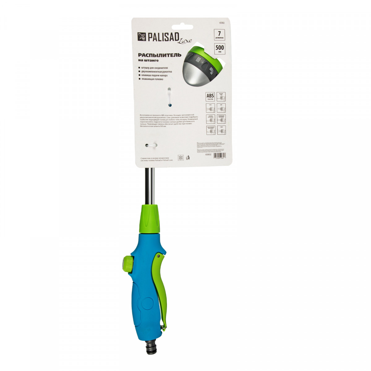 Распылитель Palisad Luxe 65802 на алюминиевой штанге длиной 500 мм, с 7 режимами работы и поворотной головой, подходит для орошения участков большой площади и растений в цветочных горшках, а также для очистки удаленных и труднодоступных мест. Расход воды можно плавно регулировать одной рукой, что облегчает решение поставленных задач.