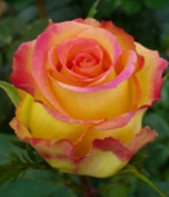 Чайно-гибридная роза. Цветы густомахровые, желтые с хорошо выраженной малиново-красной каймой, джиаметром 8-10см. Растение высотой 80 - 100 см.