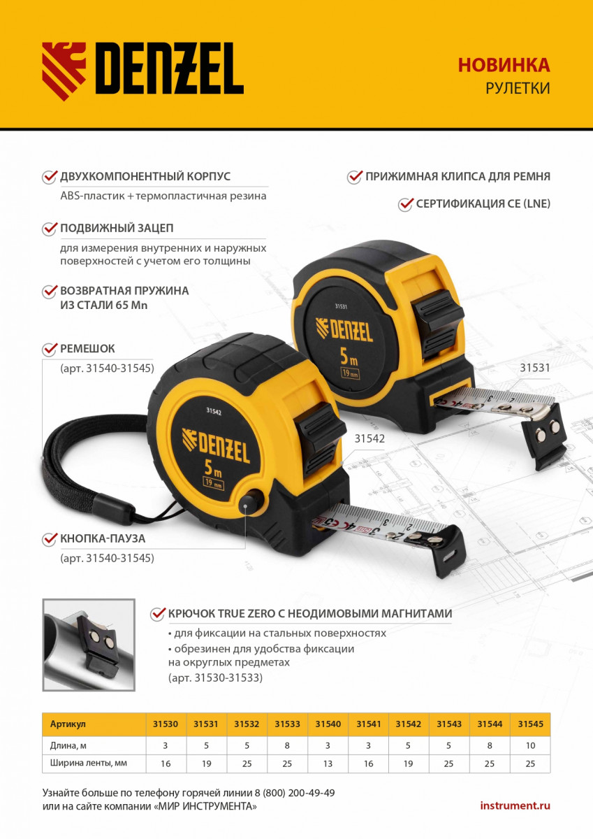 Рулетка Denzel 31532 в двухкомпонентном корпусе, с измерительной лентой шириной 25 мм и магнитным обрезиненным зацепом, позволяет определять размеры предметов и расстояния до 5 м. Широкая упругая лента упрощает проведение измерений в труднодоступных местах. Рулетка будет полезна при проведении строительных, ремонтных и различных бытовых работ.