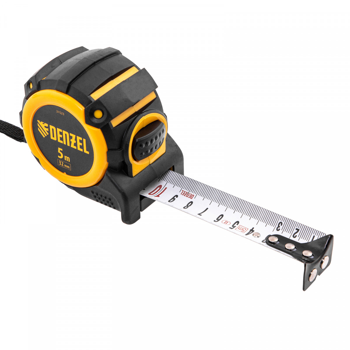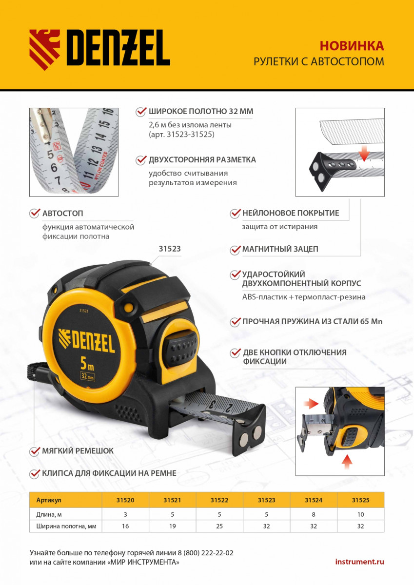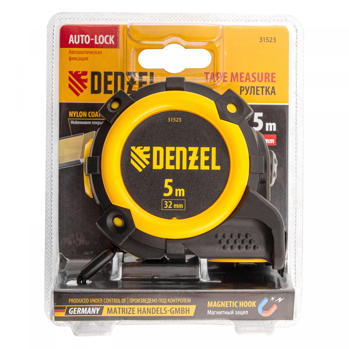 Рулетка 5м х 32мм, автоматич. фиксац., нейлон. покрытие, магнит. зацеп, двухстор. разметка Denzel