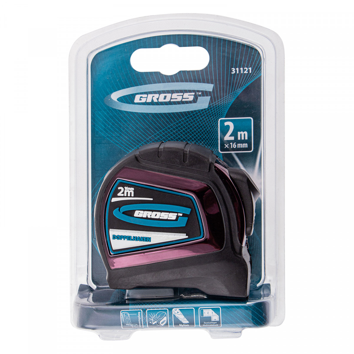 Рулетка "Doppelhaken",2 м x 16 мм,односторонний зацеп,Нейлон,двусторонняя шкала,автоматическая фиксация Gross