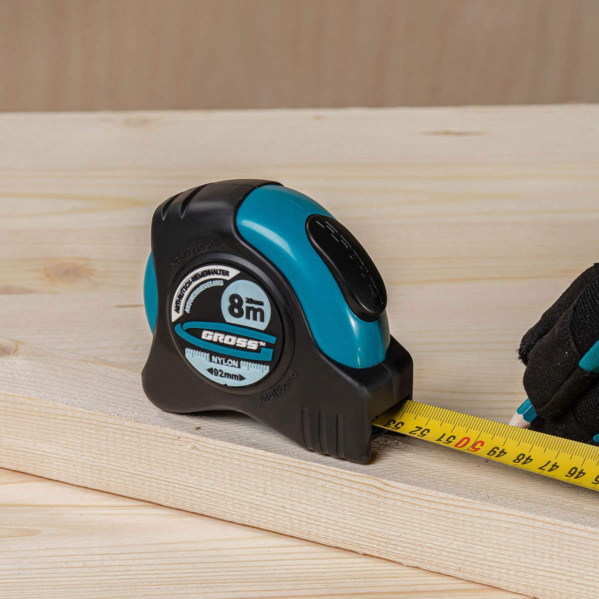 Рулетка "Schlagfest",8 м x 25 мм,магнитный обрезиненный зацеп,двусторонняя шкала,Нейлоновое покрытие,автоматическая фиксация Gross