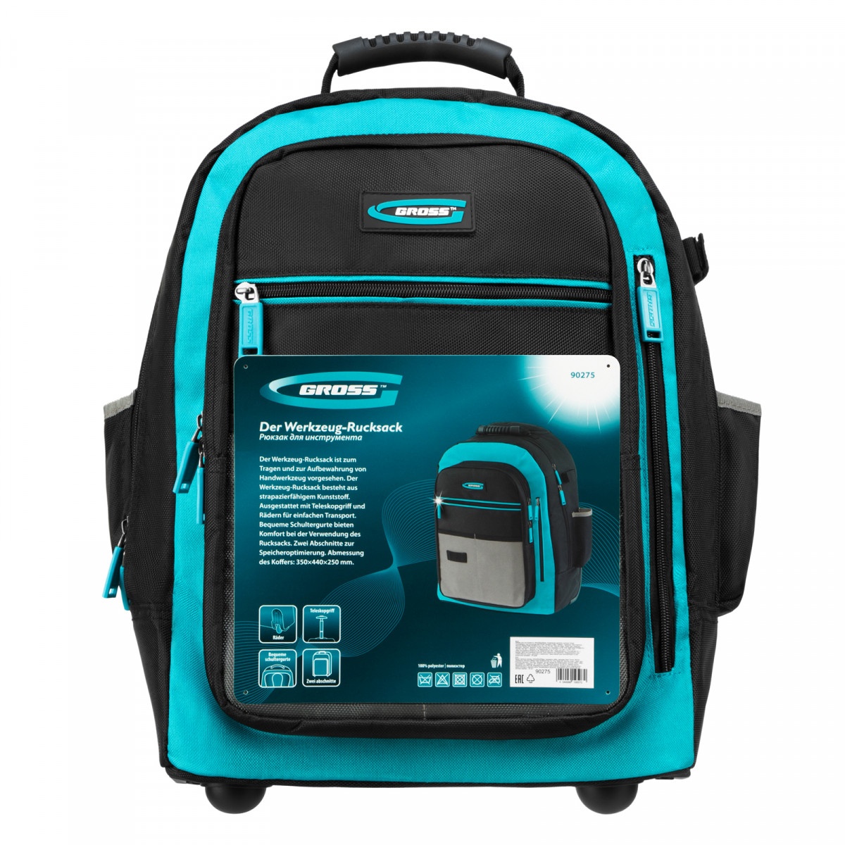 Рюкзак Gross 90275 размером 440 х 350 х 250 мм, с выдвижной рукояткой и колесами, используется для хранения и транспортировки ручного инструмента. В двух секциях с 16 внутренними и внешними карманами можно разместить все необходимые предметы. Рюкзак удобно брать в поездки и на выездные работы.