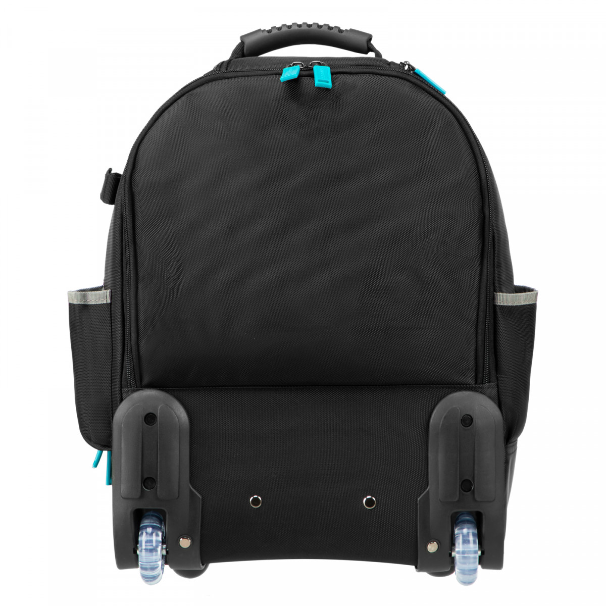 Выдвижная рукоятка и колеса облегчают транспортировку рюкзака с инструментами.