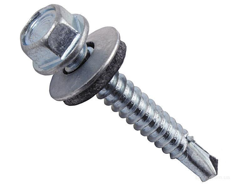 Саморез головка шестигранная с буртом. Используется для крепления металлочерепицы к деревянным и металлическим кровельным конструкциям. Резьба частая. Материал сталь.