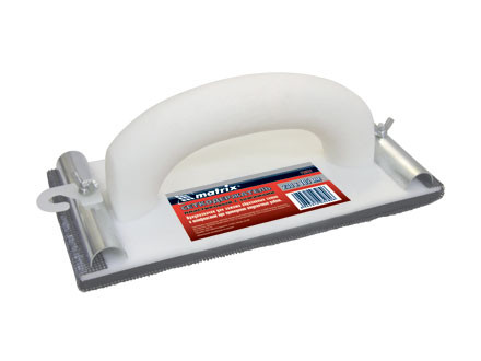 Сеткодержатель для шлифования пластиковый имеет специальные металлические фиксаторы для надёжного зажима шлифовальной бумаги и абразивных сеток. Отличительными особенностями данной конструкции являются: 1. Утолщенная ручка, обеспечивающая удобный и надежный хват. 2. Мелкопористая прокладка повышенной износостойкости. Материал, из которого она изготовлена, имеет хорошие упругие характеристики, позволяющие выдерживать большее прилагаемое усилие, а увеличенная толщина позволяет обеспечить равномерное прилегание даже на очень неровных поверхностях. 3. На элементы крепежа нанесено антикоррозионное покрытие, защищающее от ржавчины и позволяющее мыть сеткодержатель после работы. Современные материалы и технологии позволили сделать этот инструмент максимально прочным легким, дешевым и удобным в работе. Данная конструкция представлена двумя типоразмерами, соответствующими наиболее популярным размерам применяемых абразивных материалов.