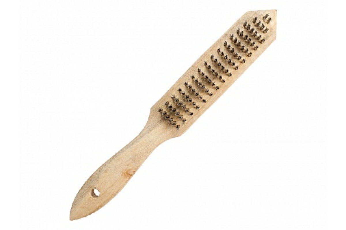 Щетина изготовлена из стальной проволоки и надежно закреплена в основании щетки. Используется для грубой зачистки рабочих поверхностей. Толщина проволоки 0,33 мм. Длина щетки 270 мм.