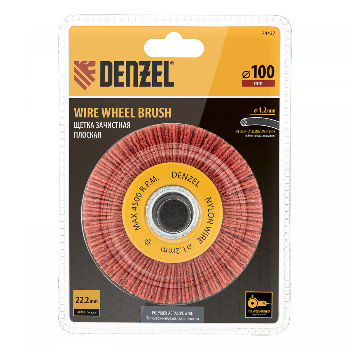Щетка для УШМ, 100 мм, Плоская, нейлоновая щетина, посадка 22,2 мм Denzel