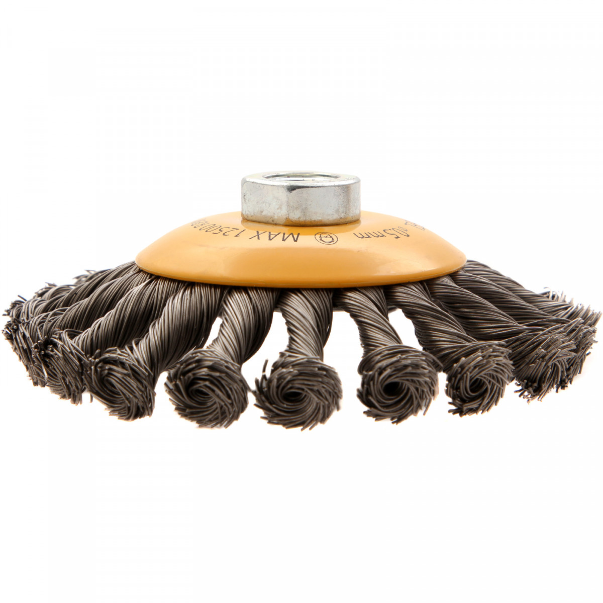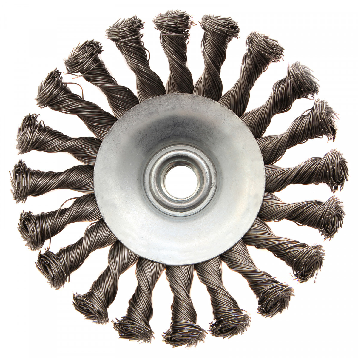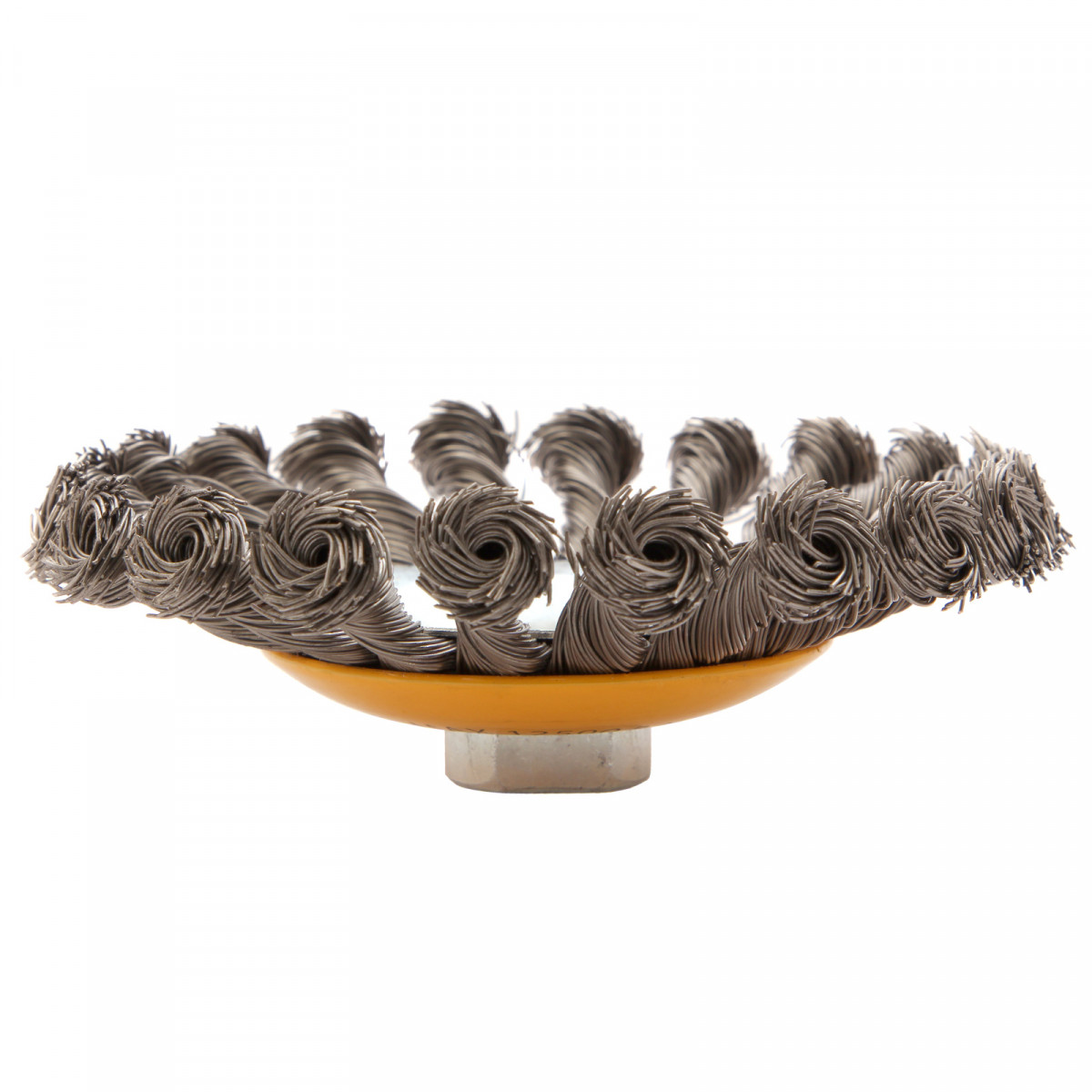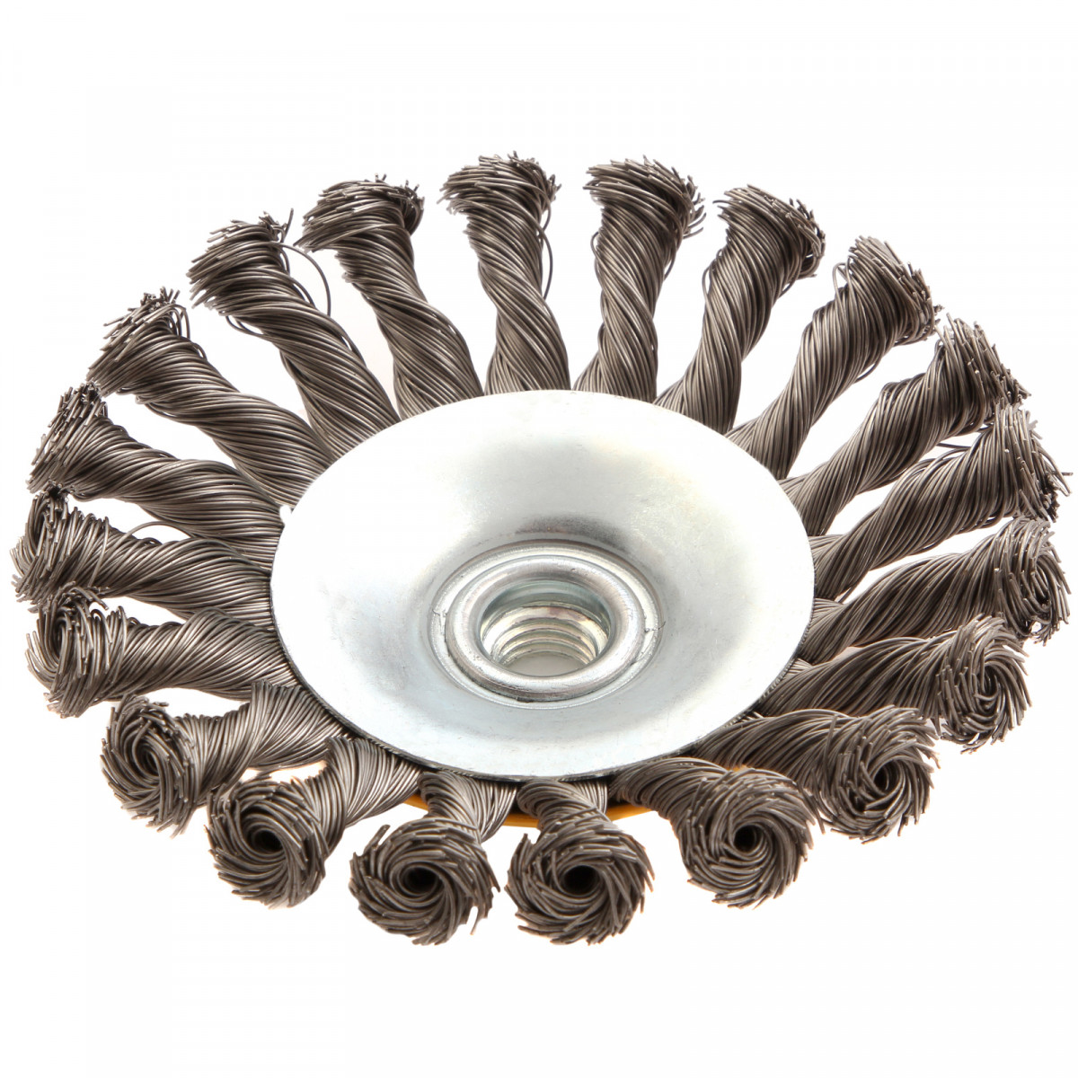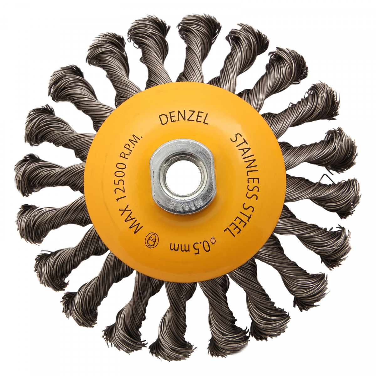 Щетка для УШМ, 125 мм, "Тарелка", крученая нержавеющая проволока 0.5 мм, М14 Denzel