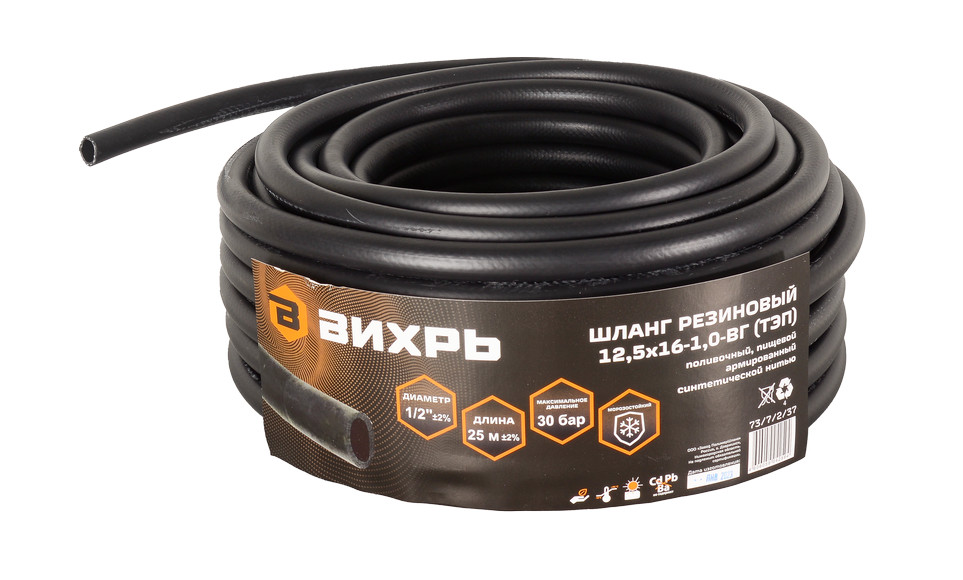 Шланг 12,5 мм 25м резиновый армированный 12,5 х 16- 1,0 - ВГ чёрный ТЭП Вихрь