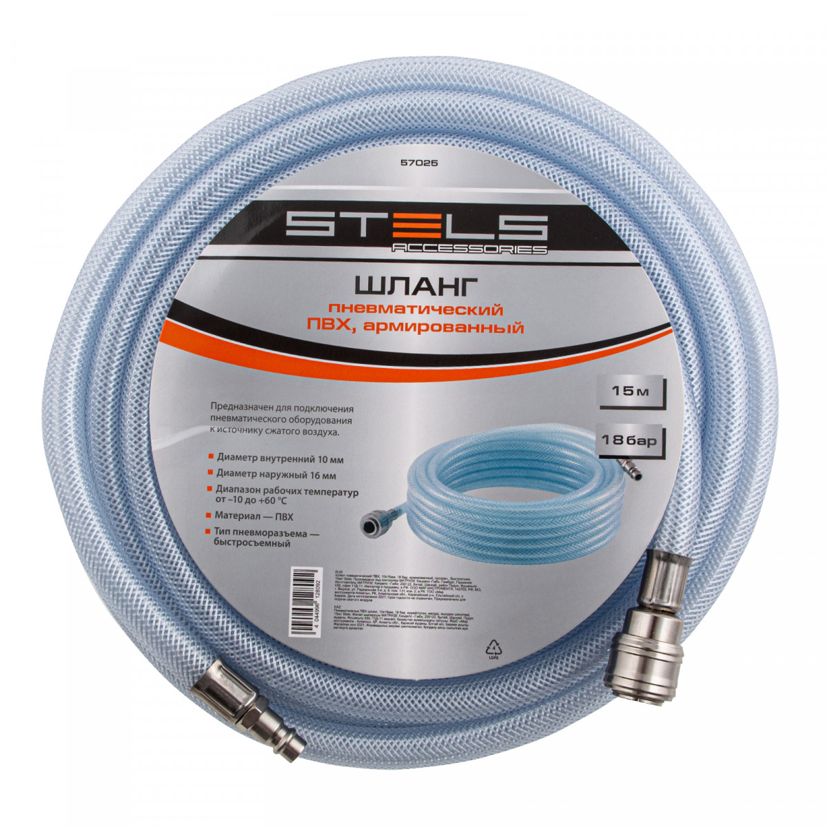 Шланг пневматический ПВХ, 10 x 16 мм, 18 бар, армированный, прозрачный, быстросъемное соединение, 15 м Stels