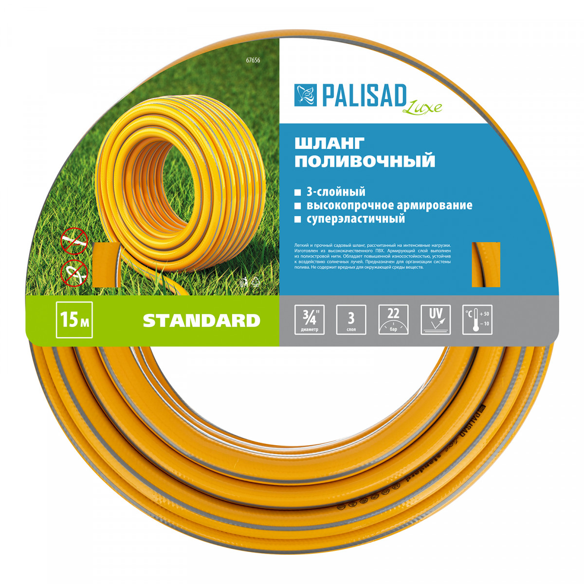 Шланг поливочный армированный 3-слойный Palisad LUXE «Standard» 67656 диаметром 3/4" и длиной 15 м применяется как для ручного, так и для автоматического орошения газонов и насаждений. Используется в саду, на даче, в небольших парках, позволяет поддерживать жизнедеятельность растений без лишних усилий. Совместим с любыми системами полива Palisad и Palisad LUXE.