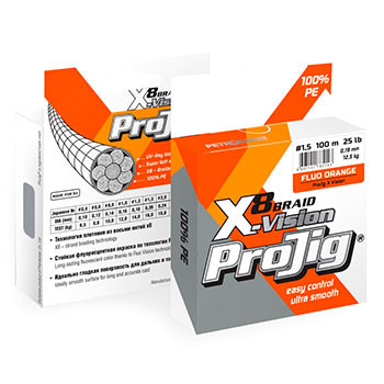 ProJig Х8-Vision - это серия мягких восьмипрядных плетеных шнуров оранжевого цвета. Имеют абсолютно круглое сечение и стойкую флуоресцентную окраску по технологии Fluo Vision. Флуоресцентный оранжевый цвет повышенной яркости обеспечивает хорошую видимость шнура на поверхности воды при дневной рыбалке, а также в темное время суток, когда для освещения используется фонарик.