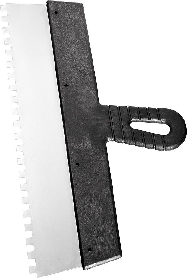 Шпатель из нержавеющей стали с квадратными зубьями обеспечивает равномерное нанесение шпаклевки на поверхность.