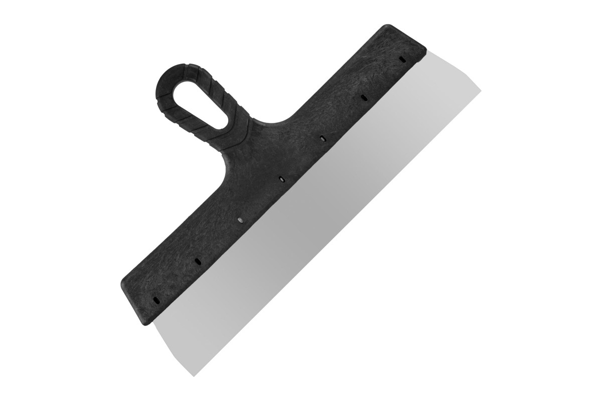 Фасадный шпатель из нержавеющей стали с пластиковой рукояткой предназначен для нанесения и разравнивания толстого шпаклевочного слоя и штукатурных смесей на большие поверхности. Ширина шпателя составляет 350 мм, что позволяет комфортно разравнивать раствор на большой по площади поверхности, чтобы получить ровное основание для последующей отделки.