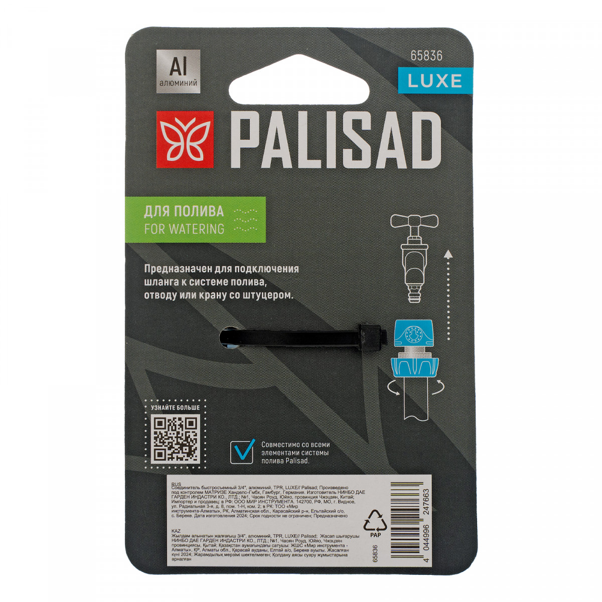 • Универсальность — соединитель можно использовать с элементами всех поливочных систем линейки Palisad.