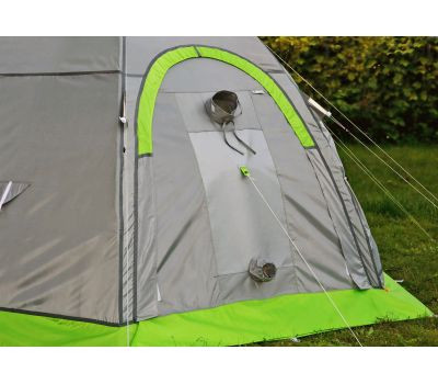 Стенка герметично крепится к раскрытой палатке при помощи специальной тракторной молнии, установленной на D-образном входе палатки. Сложение палатки можно производить вместе с огнеупорной стенкой.