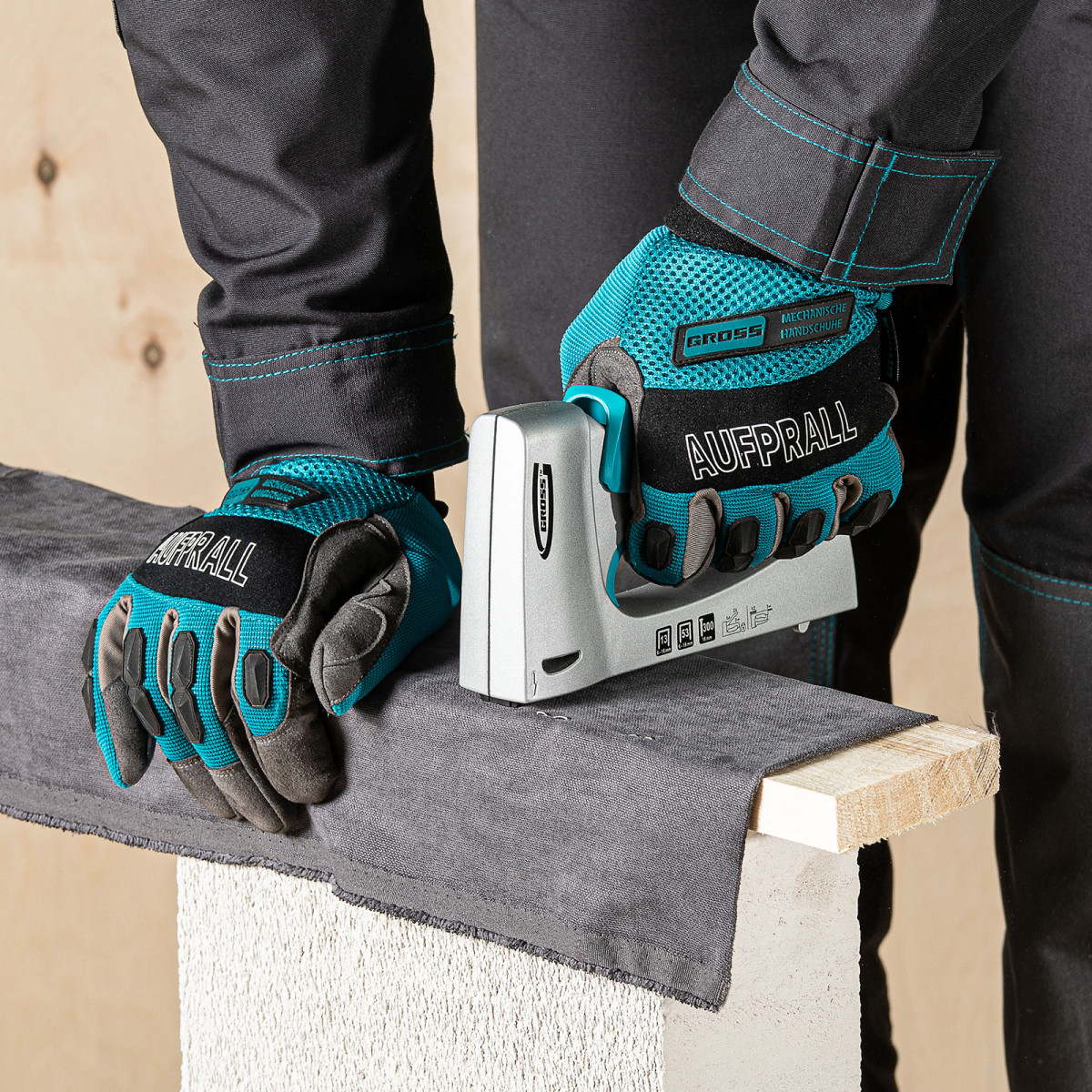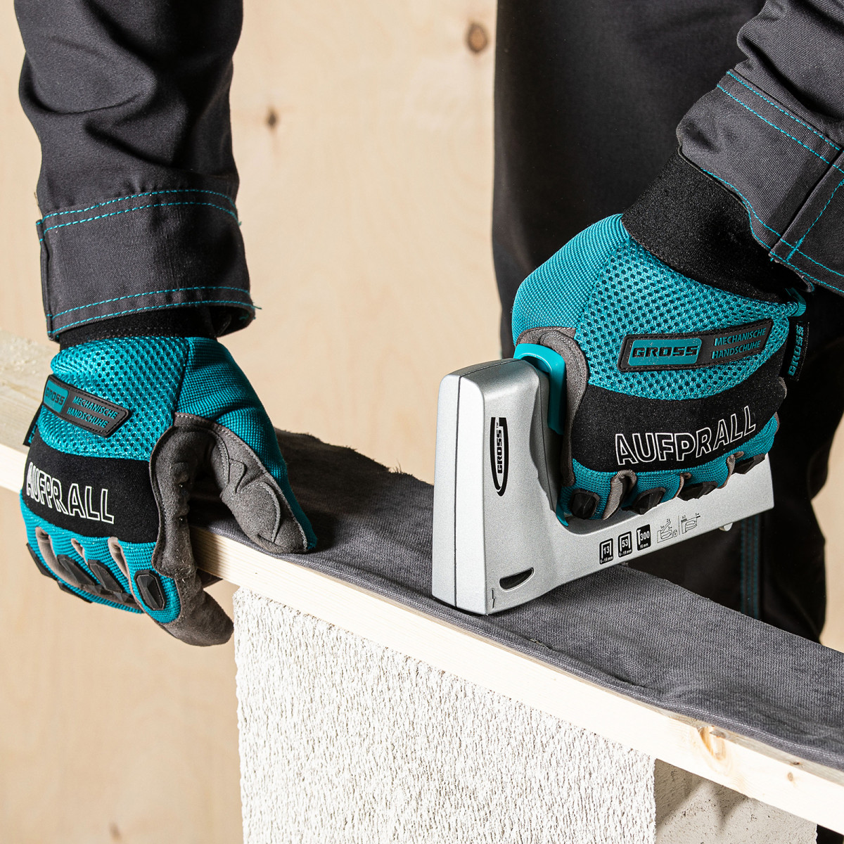 Мебельный степлер Gross 41001 в алюминиевом корпусе работает со скобами типа 13 и 53 размером 6-10 мм и гвоздями типа 300 размером 10 мм. Позволяет крепить к деревянным основаниям листовые материалы из фанеры, оргалита, ДВП, ДСП, а также пленку и утеплитель. Используется для сборки и обшивки мебели, укладки напольных покрытий, выполнения теплоизоляционных и багетных работ. Сбалансированная конструкция позволяет минимизировать отдачу и снизить нагрузку на кисть. Степлер обладает значительным запасом прочности и рекомендован для профессиональных работ.