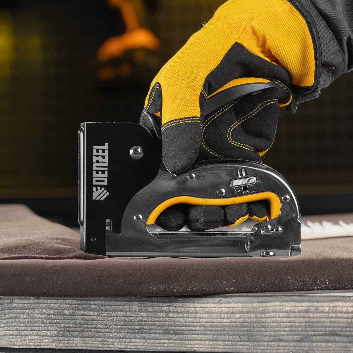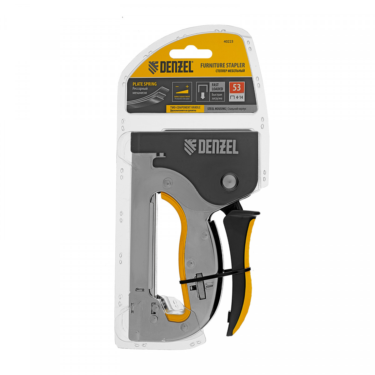 Металлический степлер Denzel 40223 с функцией плавной регулировки удара и двухкомпонентной рукояткой применяется для быстрого скрепления с деревянными основаниями листов фанеры, оргалита, ДСП, ДВП, картона или изоляционных материалов с помощью скоб типа 53 размером 4-14 мм. Инструмент подходит для частого использования, т. к. ударный механизм рессорного типа снижает усталость при длительной эксплуатации. Степлер пригодится во время сборки и обивки мебели, а также для проведения ремонтных работ.