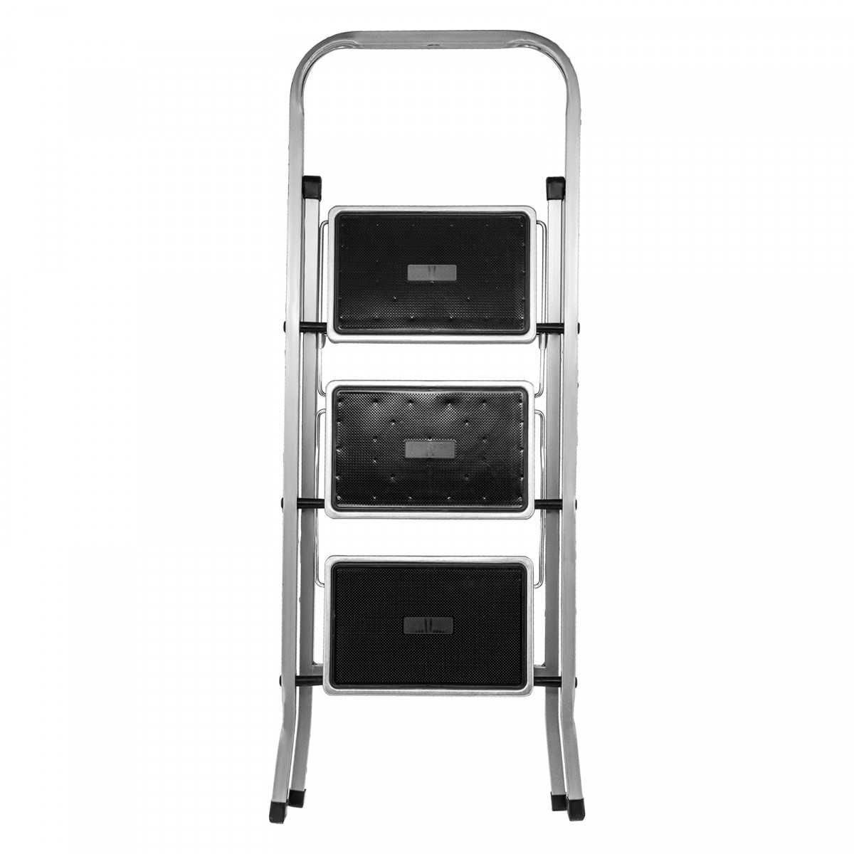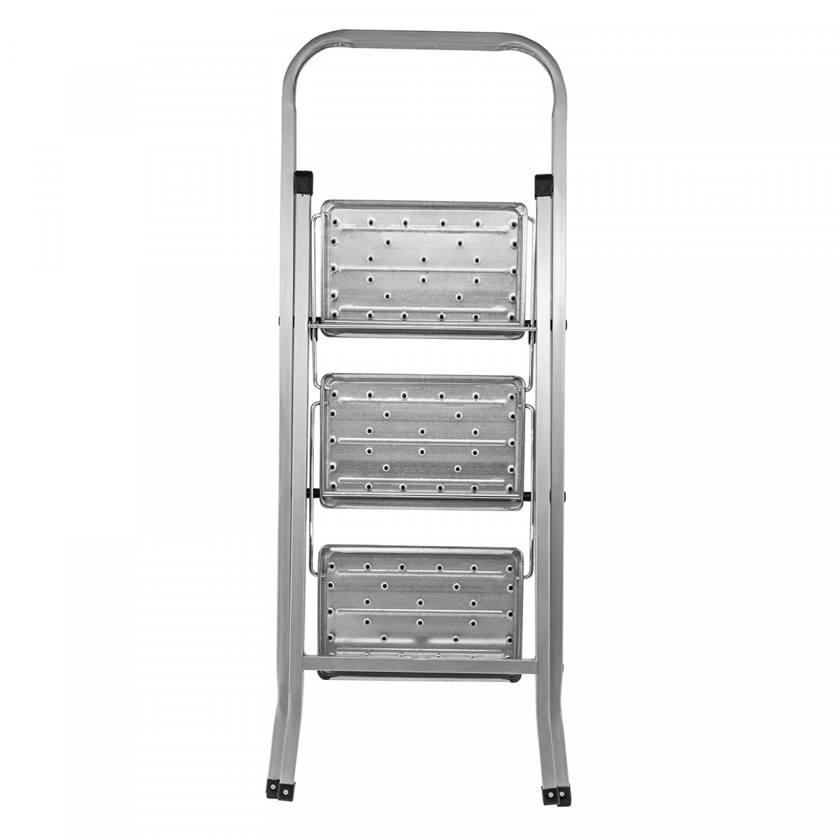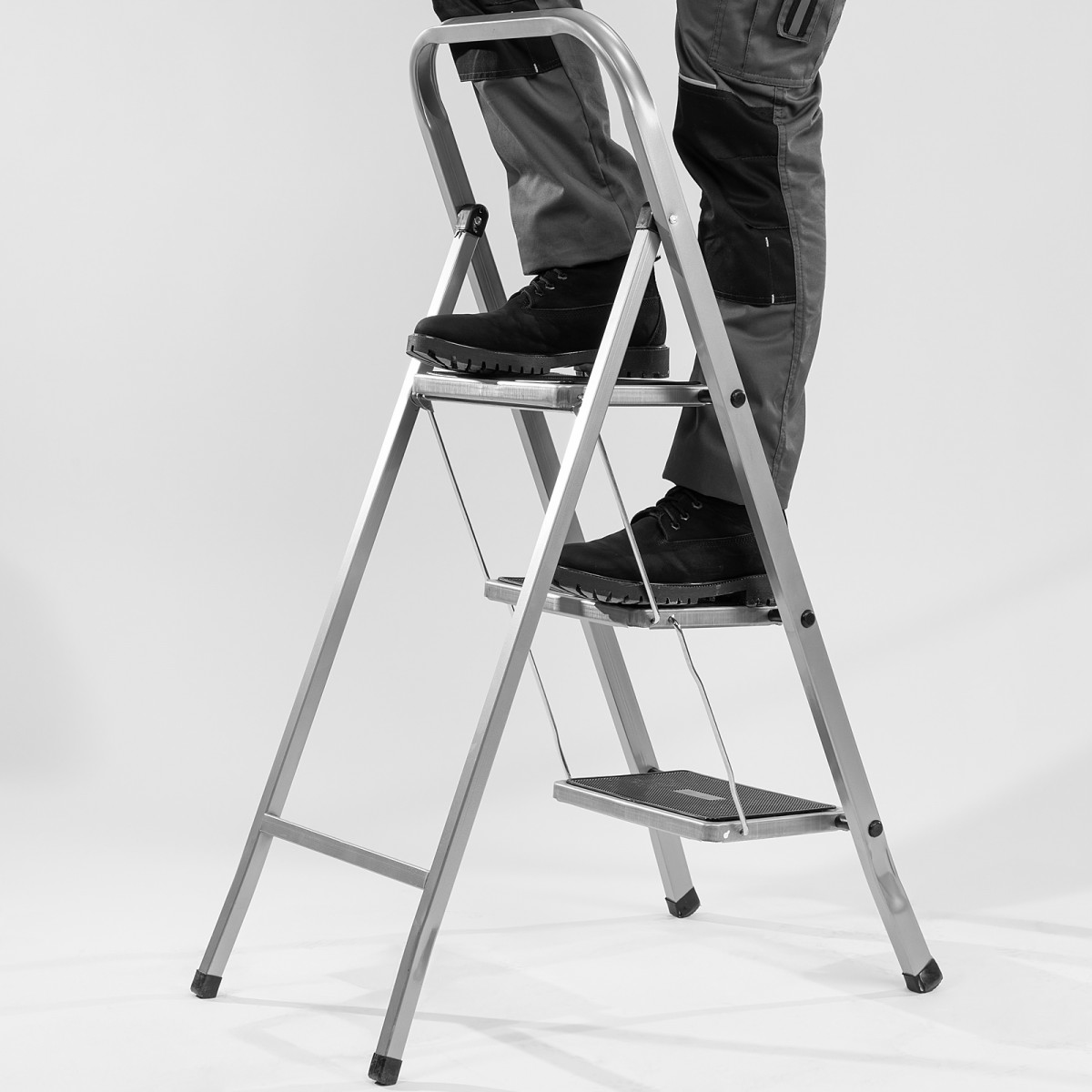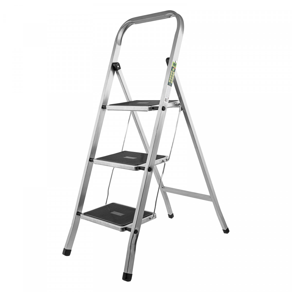 • Прочность — рама и ступени изготовлены из стали, поэтому стремянка выдерживает нагрузку 120 кг.