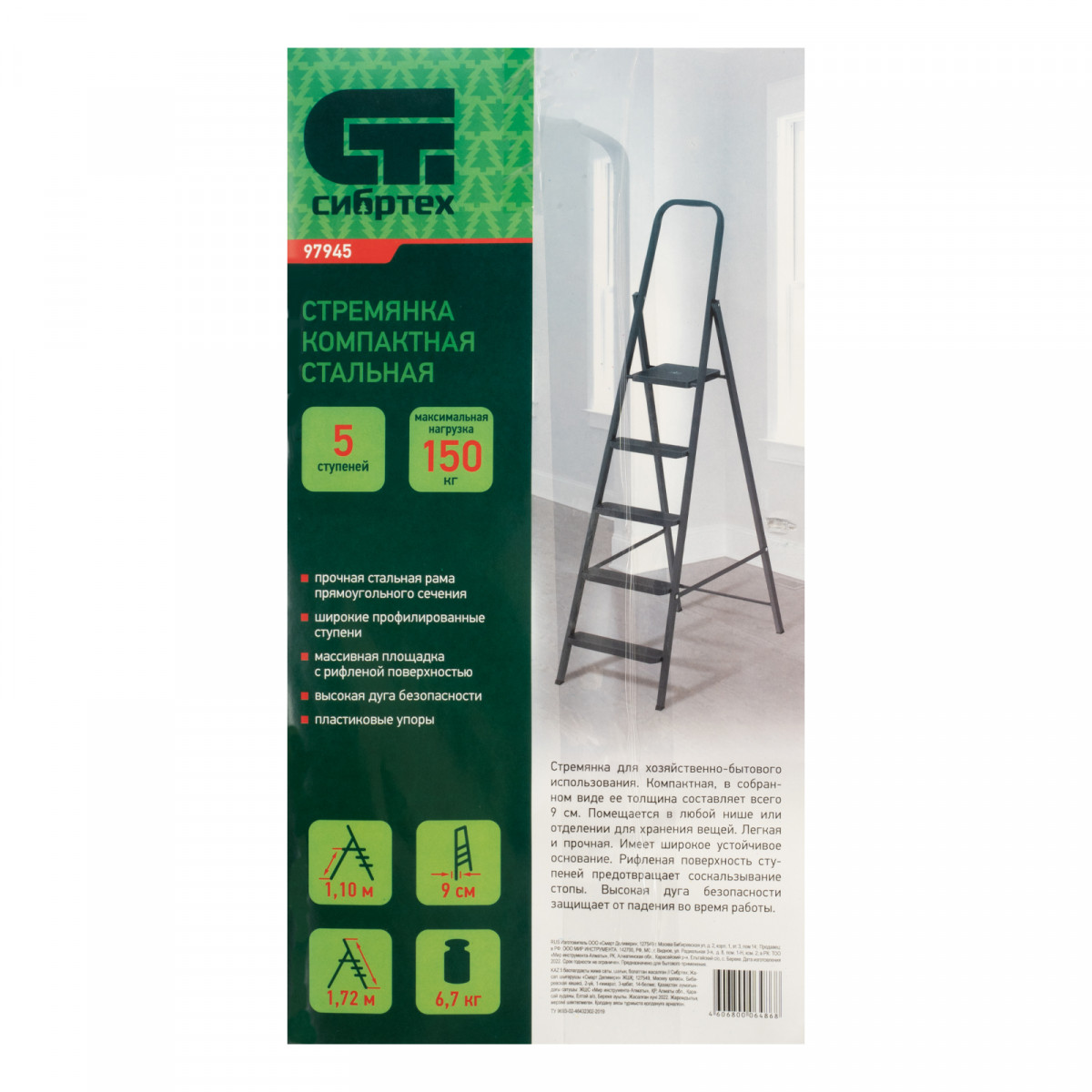 Стремянка компактная стальная Сибртех 97945 с 5 ступенями служит для проведения работ на высоте, превышающей человеческий рост. Стальные профилированные рама и ступени рассчитаны на нагрузку до 150 кг. Площадка находится на высоте 110 см от опорной поверхности, рабочая высота стремянки составляет 310 см (при среднем росте пользователя 170 см). Использовать стремянку можно дома, на даче или в гараже, а также во время строительства и ремонта.