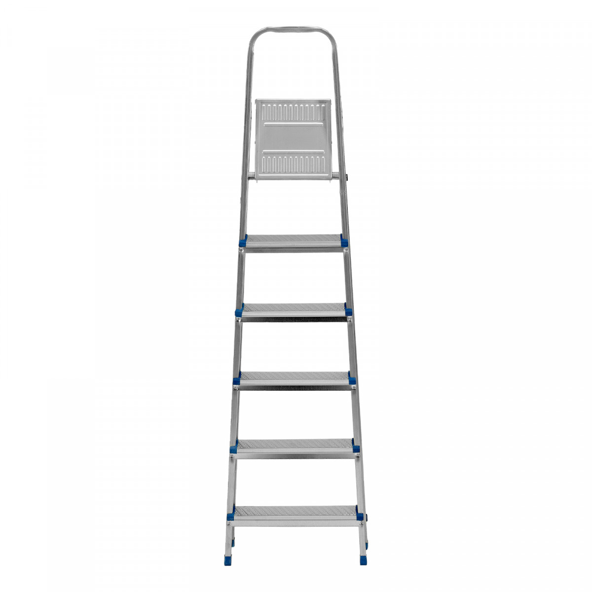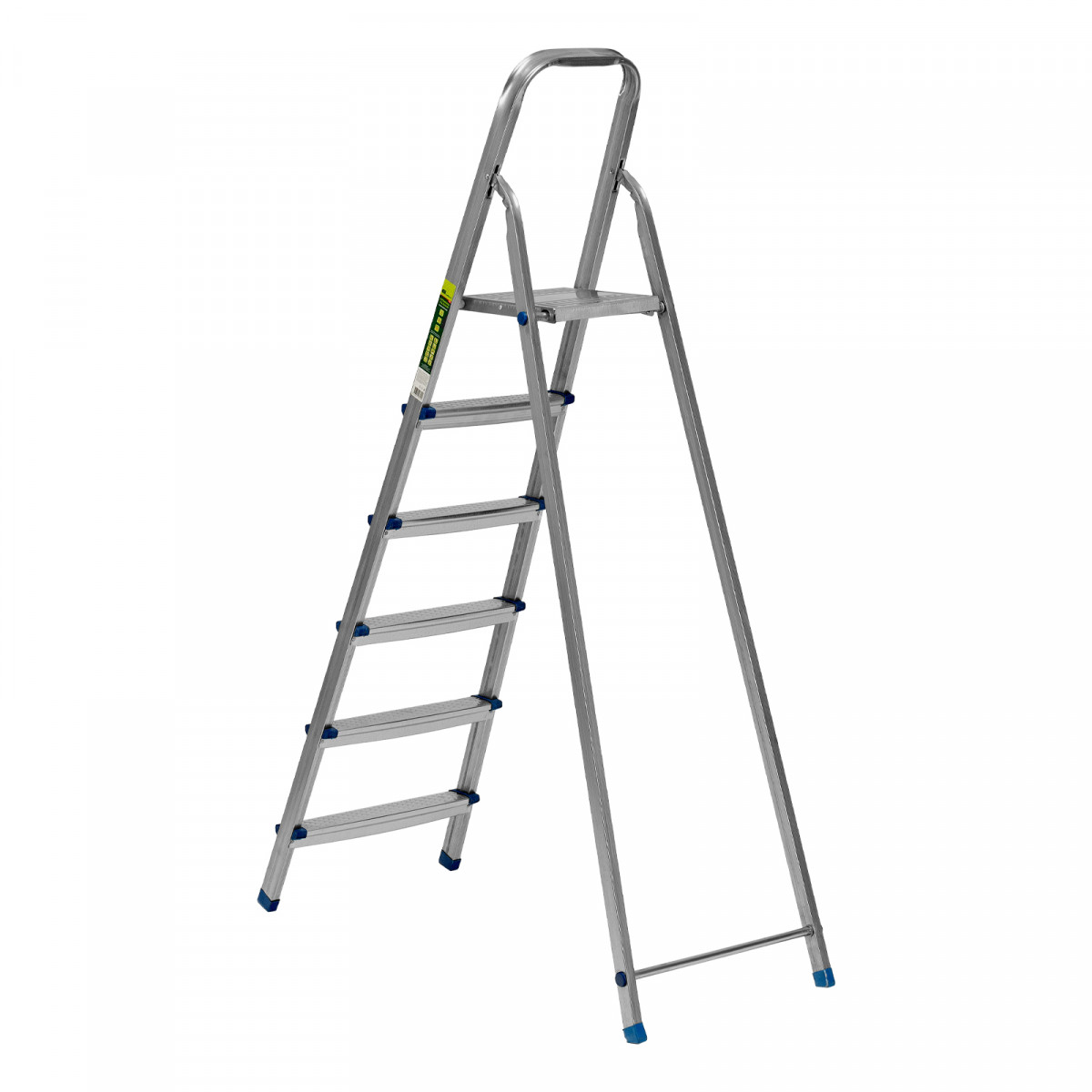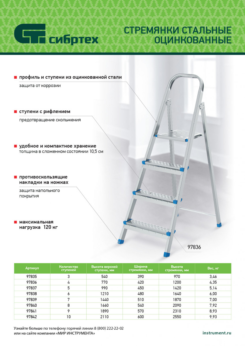 Стальная оцинкованная стремянка Сибртех 97838 с 6 ступенями позволяет повесить полку, картину или шкафчик, достать нужный предмет и решить другие задачи, для которых требуется доступ к предметам на высоте. Рама и ступени из стального профиля выдерживают вес до 120 кг. Расстояние от опорной поверхности до площадки составляет 121 см, при среднем росте пользователя 170 см рабочая высота лестницы — 321 см. Необходимо соблюдать технику безопасности: размещать стремянку только на ровной плоскости и не использовать ее для работы с дрелью, шуруповертом и другим электроинструментом.
