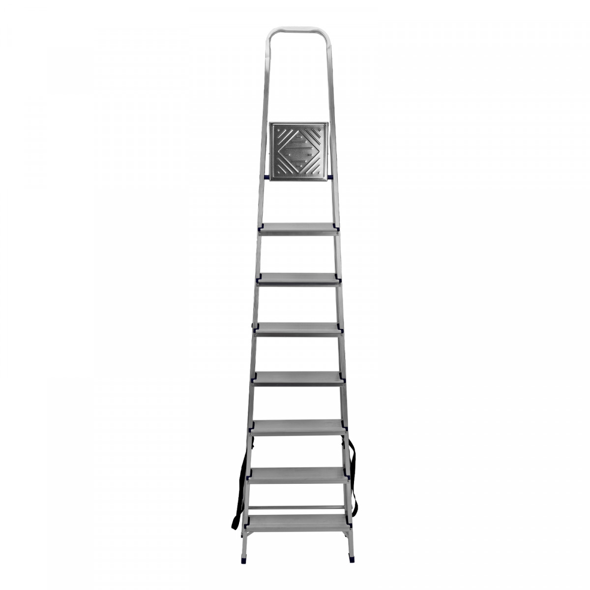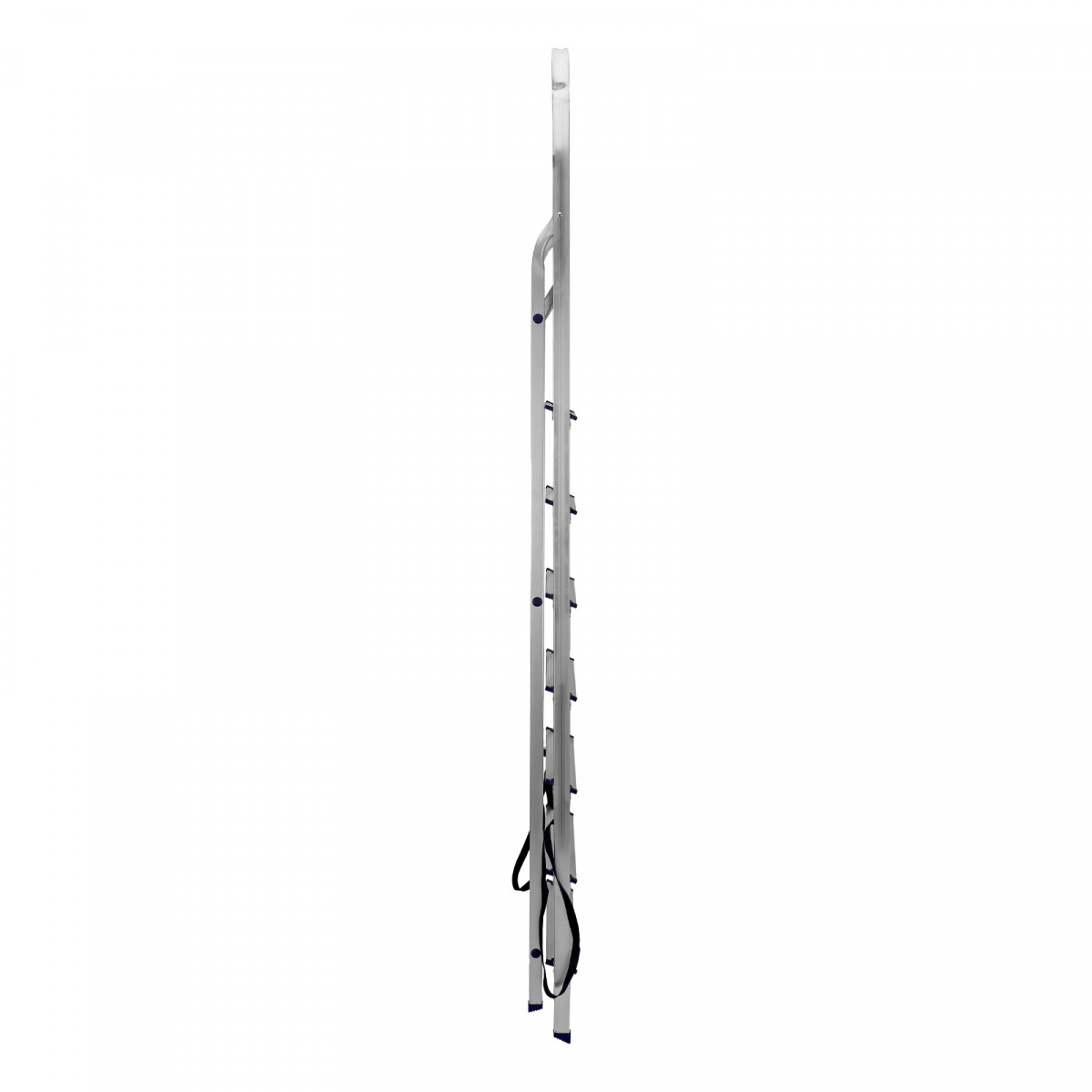 • Надежность — рама из прямоугольного алюминиевого профиля выдерживает нагрузку до 150 кг, широкие ступени закреплены заклепками, страховочные стяжки повышают прочность конструкции.