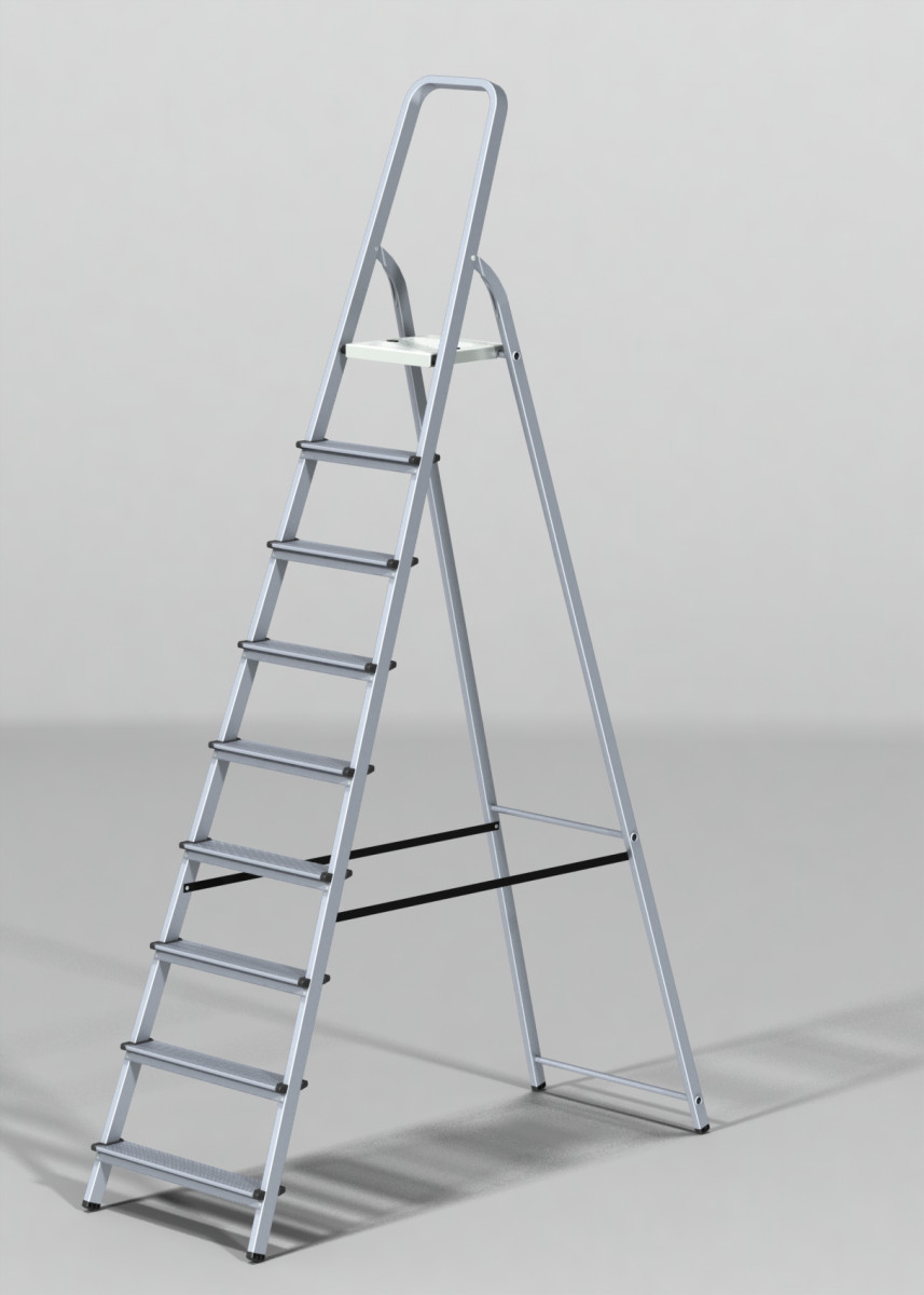 Прочность и надежность алюминиевой стремянки обеспечиваются стальными профилями и прочным креплением ступеней.